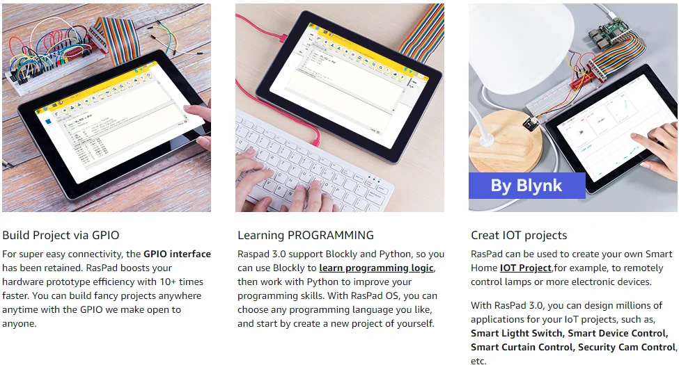 Cuenta con 3 puertos USB 3.0 y 5 horas de potabilidad de la batería.RasPad se puede ampliar con un monitor lateral para que la eficiencia se pueda aumentar dos veces.