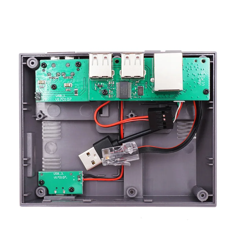 2.Conecte la placa PCB al conector USB, al conector del cable Ethernet y al conector de alimentación Raspberry Pi en la parte inferior de la carcasa.Alinee la interfaz HDMI y la interfaz de audio con los orificios abiertos, asegure la placa PCB y atornille los dos tornillos cortos negros en ambos lados del enchufe de alimentación Raspberry Pi para fijar la placa PCB.