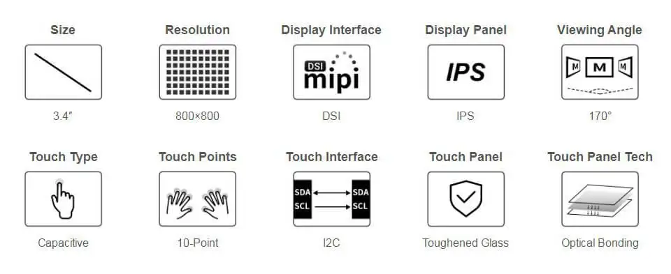 This 3.4-inch DSI round capacitive touch screen features an 800x800 pixel IPS display panel with 10-point touch control. The DSI communication interface works in conjunction with the I2C touch interface, providing a wide 170° viewing angle. The tempered glass panel and fully laminated touch technology ensure the high quality and stability of the product. This product is specifically designed for Raspberry Pi and comes with Raspberry Pi OS system drivers. It supports Pi 5/4B/3B+/3A+ models, while some CM3+/4 models require an adapter cable.【Device and System Support】