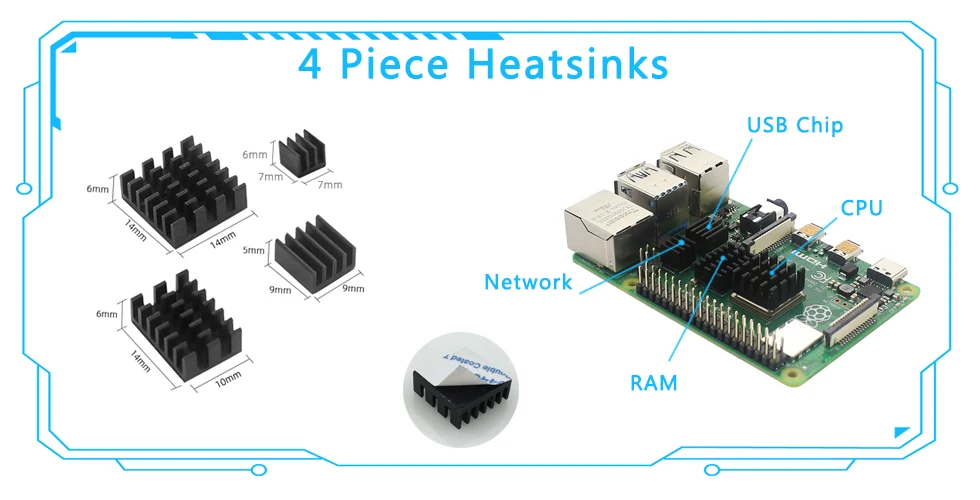 El aluminio es de material metálico y tiene una rápida conductividad térmica. Cada disipador de calor tiene adhesivo térmico en la parte posterior, para que pueda pegarlo fácilmente en Raspberry Pi.