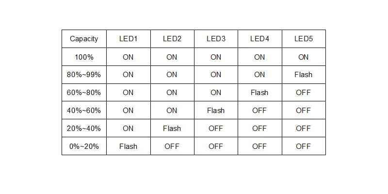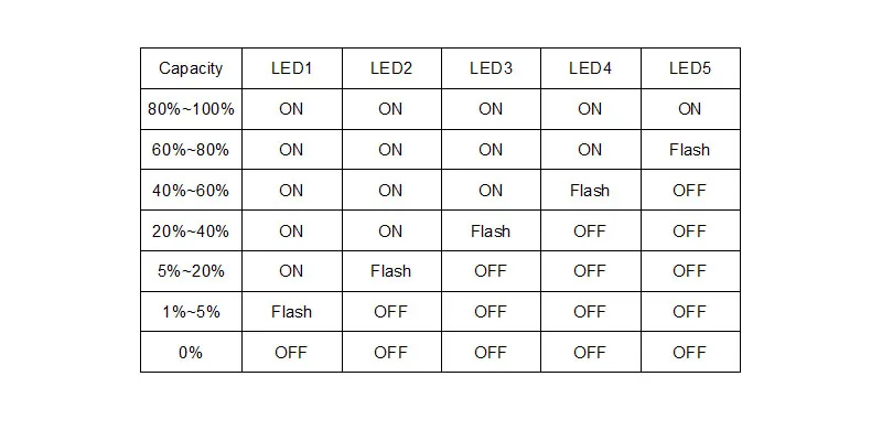 4.Hay 5 LED indicadores de energía en el módulo, que pueden mostrar el estado de energía de la batería.