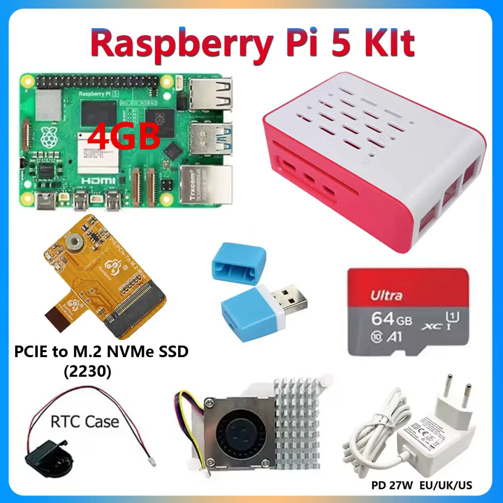 Comprar Raspberry Pi 5 8GB/4GB/2GB Kit opcional PCIE a M.2 NVME SSD(2230)+27W de alimentación+funda PI5 roja-blanca+tarjeta 64GB+lector de tarjetas+tarjeta RTC
