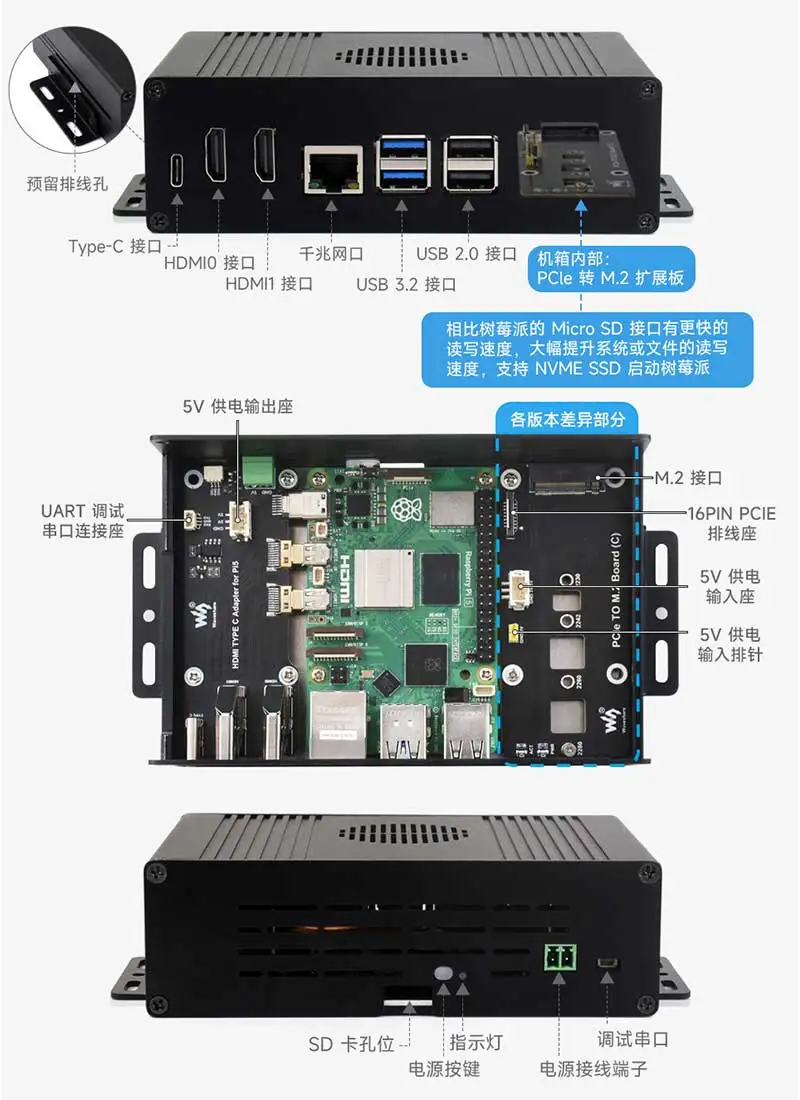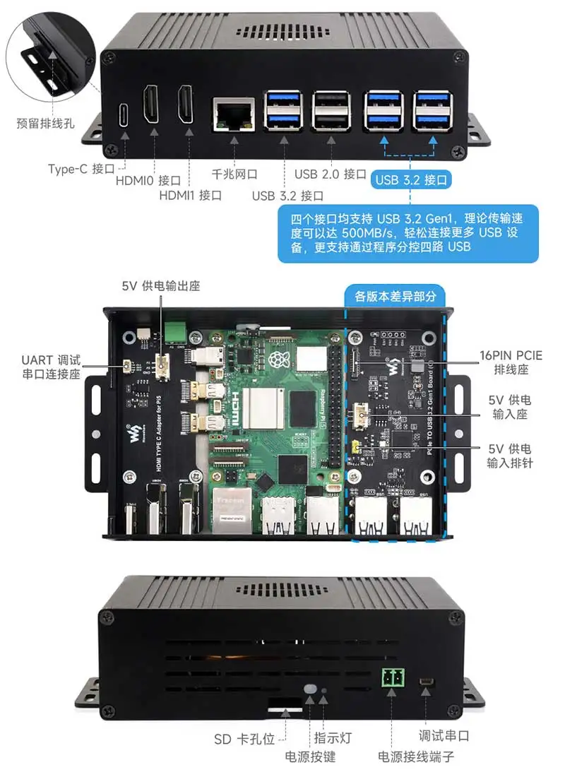 [] Cada versión viene con una placa adaptadora Micro HDMI a HDMI y admite la interfaz tipo C, HDMI y bloques de terminales, de modo que la interfaz no quede oculta profundamente en el chasis, lo que hace que sea conveniente que otros periféricos accedan a la interfaz HDMI. y admite dos métodos de suministro de energía: frontal y posterior.