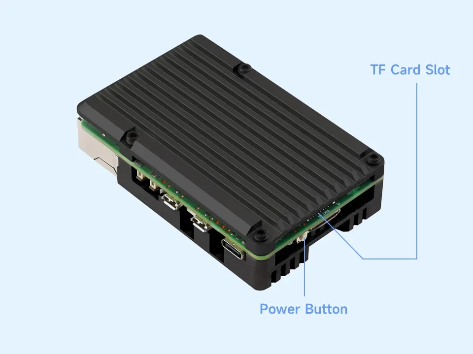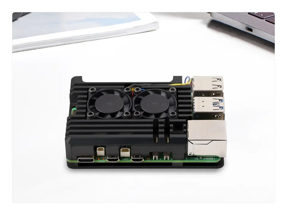 Basado en Raspberry Pi 5Caja de aleación de aluminio, con ventiladores de refrigeración silenciosos duales y disipador de calor de aluminio.