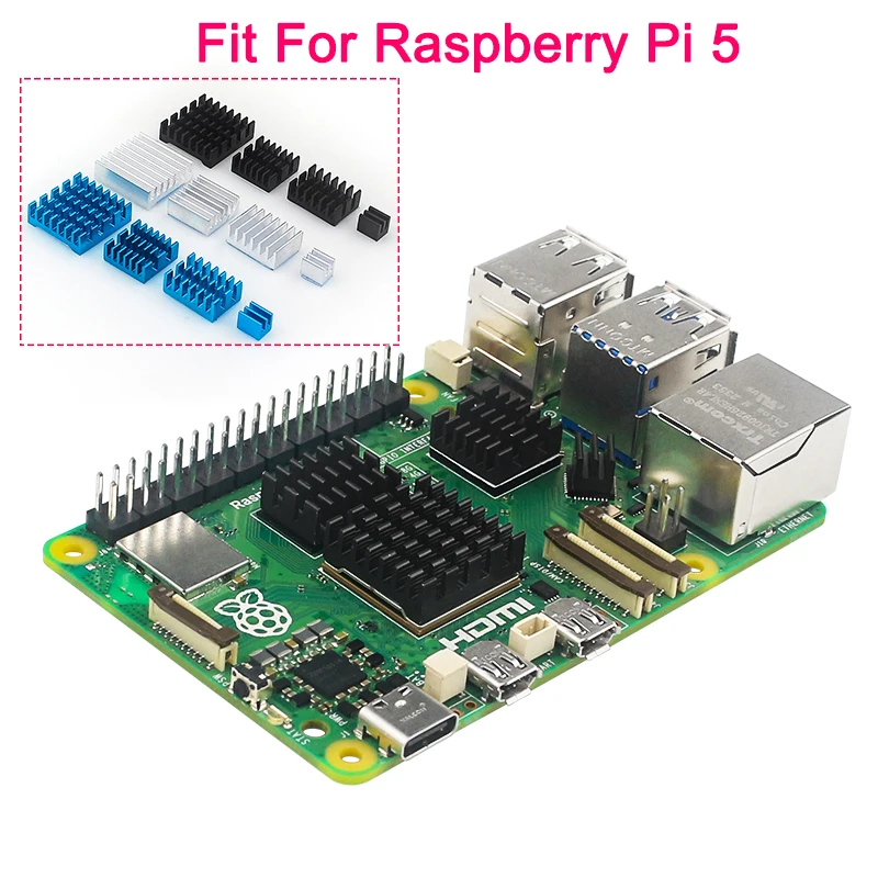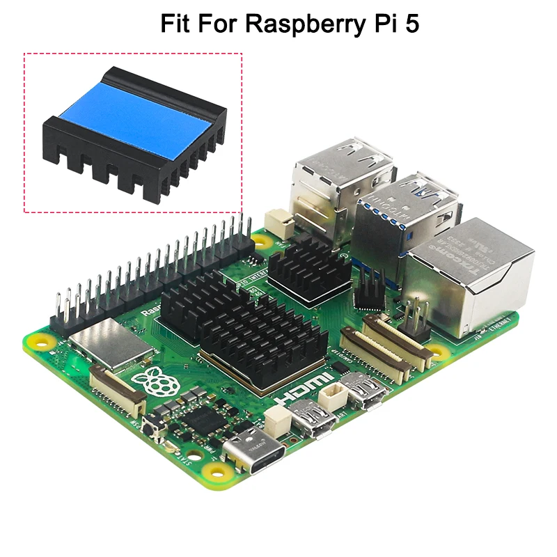 Aluminum alloy heatsinks for Raspberry Pi. We have specially customized a perfectly fitting heat sink for the CPU shape of Raspberry Pi 5.