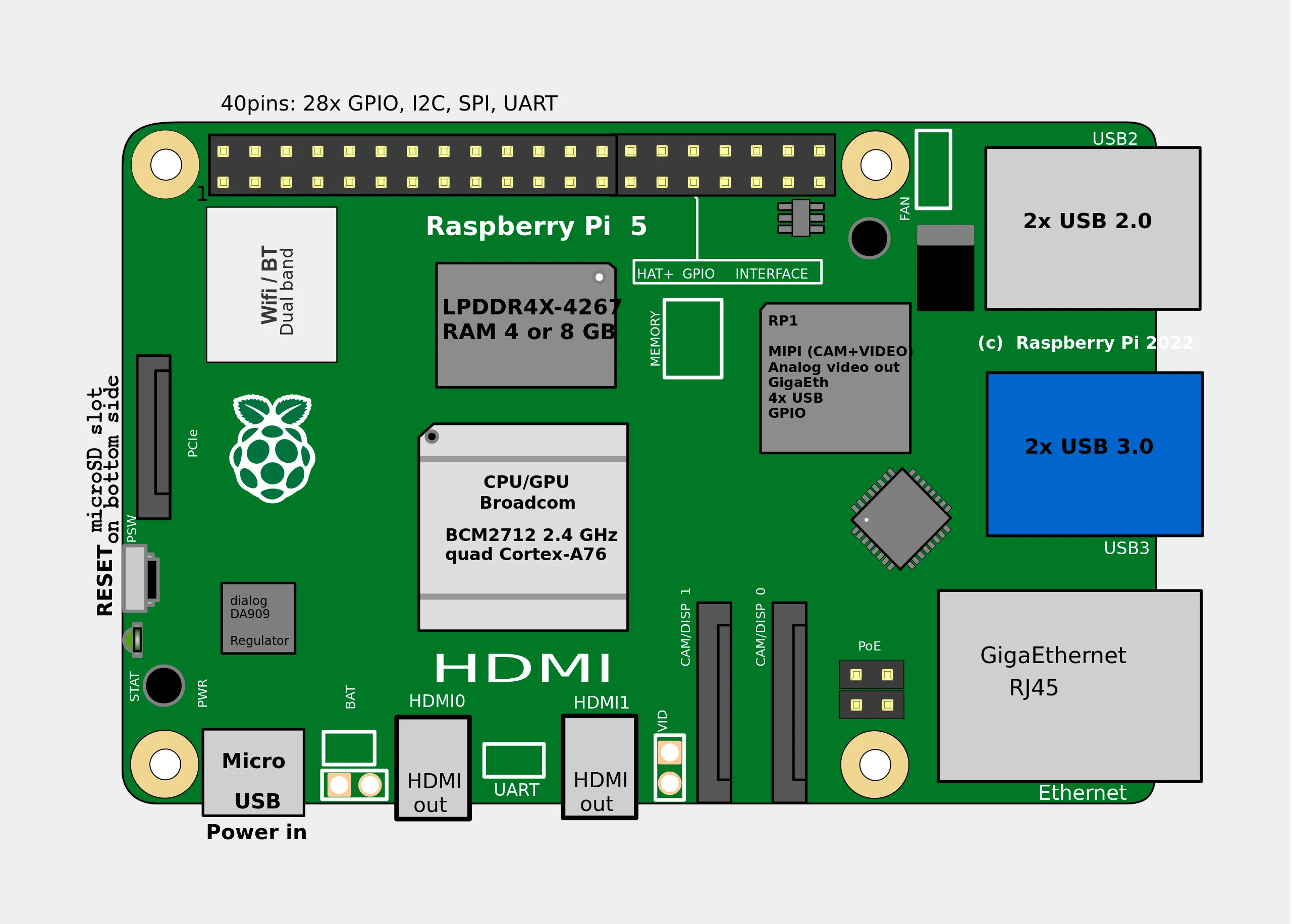 Raspberry Pi 5 cuenta con el procesador Arm Cortex A76 de cuatro núcleos Broadcom BCM2712 @ 2,4 GHz, lo que lo hace hasta tres veces más rápido que la generación anterior.Con variantes de RAM de hasta 8 GB, esta es la experiencia Raspberry Pi más rápida y fluida a la vez.