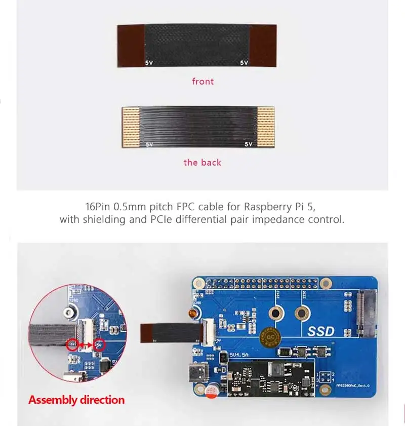 En general, los requisitos de corriente marcados en SSD pueden ser 2,5 A, 2,7 A o incluso 3A, pero esta corriente corresponde al valor máximo del modo PCle X4. Sin embargo, Raspberry Pi 5 solo admite el modo X1. Por lo que la corriente real necesaria es mucho menor. Nuestros diseños satisfacen la mayoría de las necesidades de SSD.