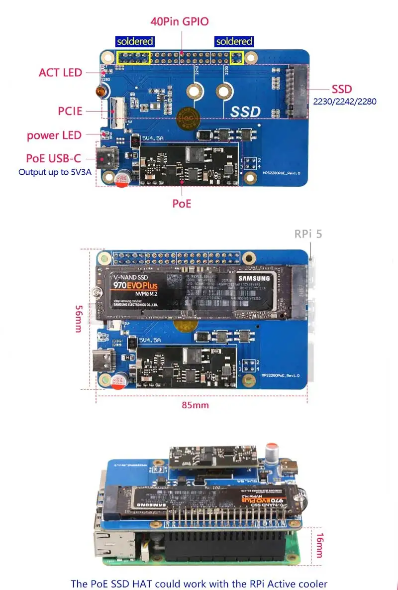 Comprar Raspberry Pi 5 PCIe a M.2 NVMe SSD HAT con placa adaptadora POE MPS2280-POE PCle x1 Gen2 y Gen3 Pi5 2280/2242/2230