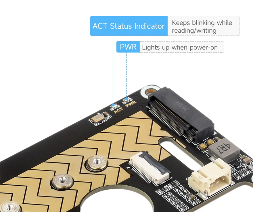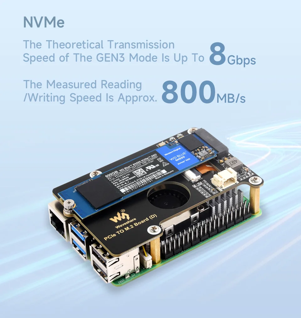 [] Velocidad de lectura/escritura más rápida en comparación con la ranura para tarjeta TF de Raspberry Pi, lo que mejora en gran medida la eficiencia de lectura/escritura del sistema o los archivos, admite el arranque de Pi5 desde la unidad de estado sólido NVME.