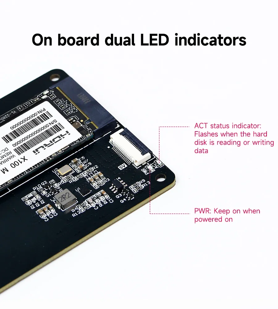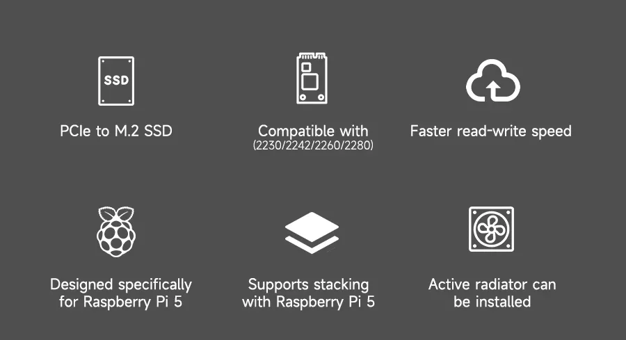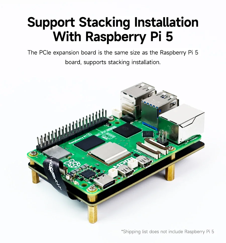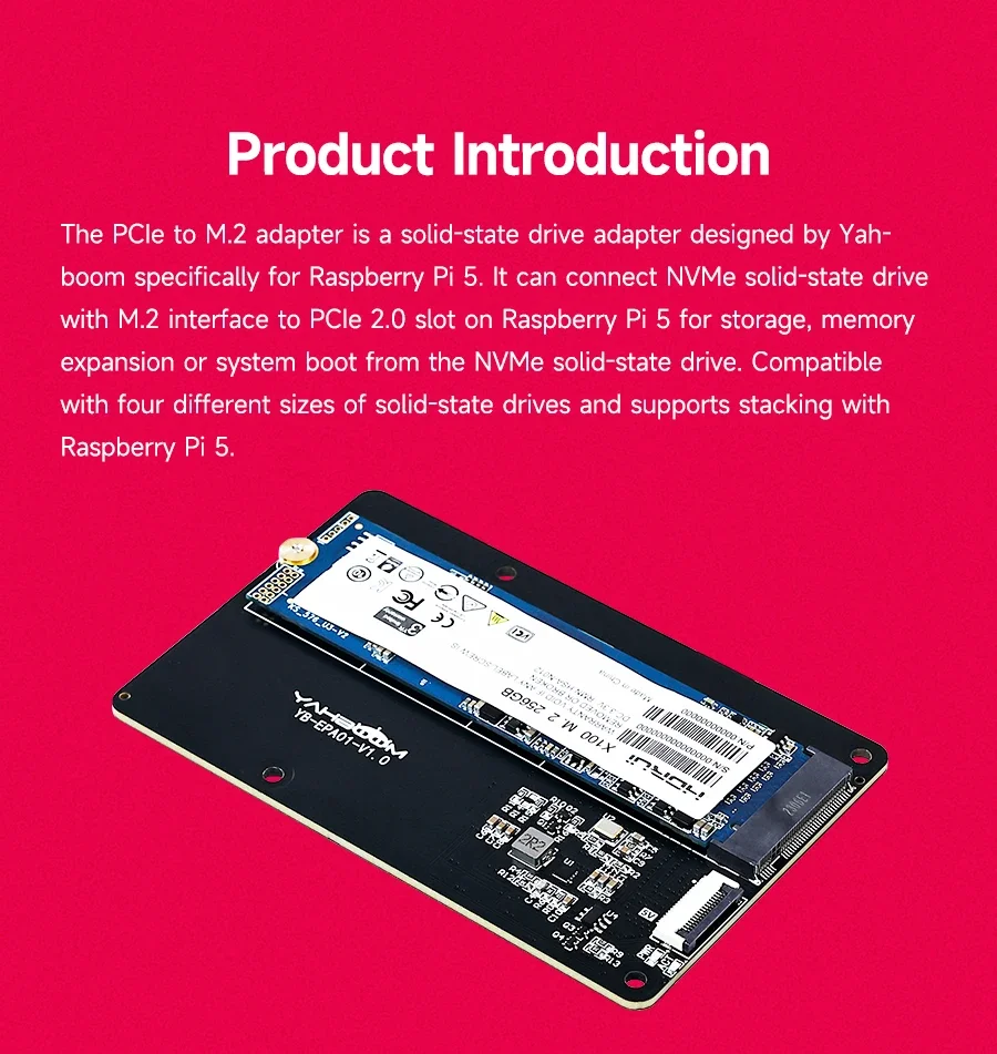 This PCIe to M.2 expansion board specially designed for Raspberry Pi 5 is designed to bring more possibilities to your Raspberry Pi projects. With this expansion board, you can easily connect a high-speed M.2 NVMe solid-state drive to the Raspberry Pi 5, greatly increasing data transfer speed and storage capacity. It supports M.2 solid-state drives of various sizes (such as 2230, 2242, 2260 and 2280), and the installation process is simple and intuitive, so you can get started quickly without complicated settings. It not only expands the storage space of Raspberry Pi 5, but also provides better support for your computing tasks, making your Raspberry Pi 5 capable of more complex application scenarios.