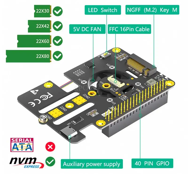 [] M.2 NVMe to PCI-e Adapter is designed for the latest Raspberry Pi 5. It supports the installation of NVMe (M-key) drives in M.2 format sizes 2230, 2242, 2260 and 2280.