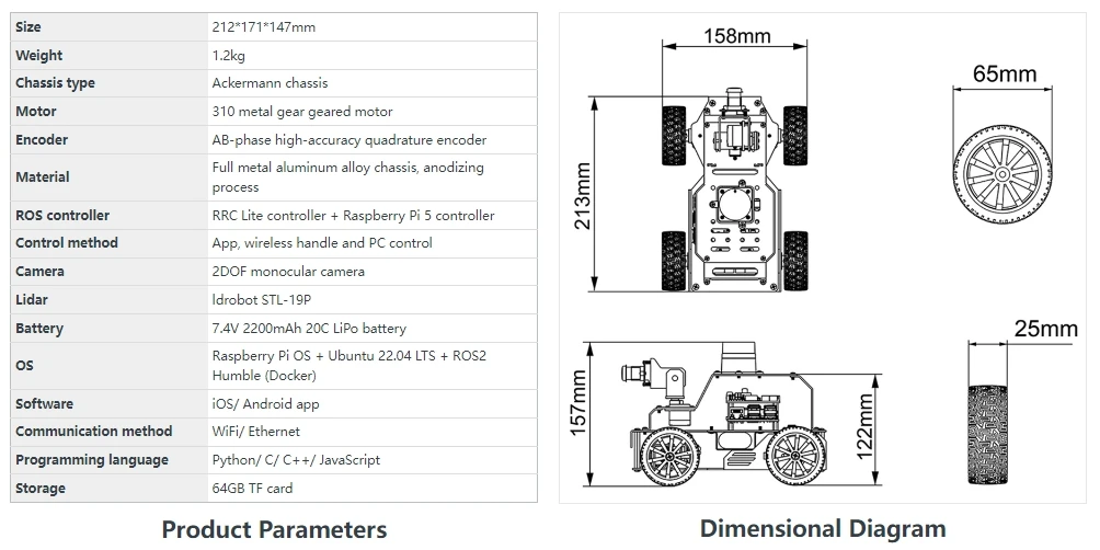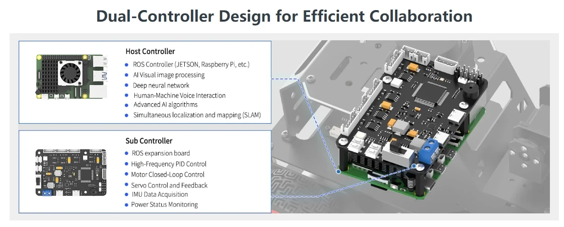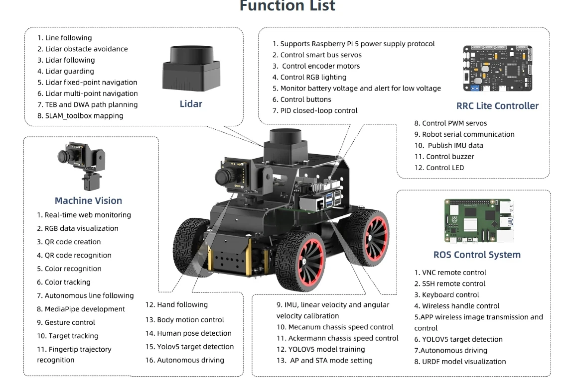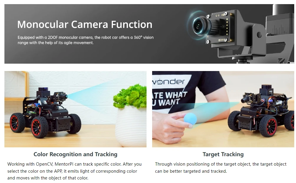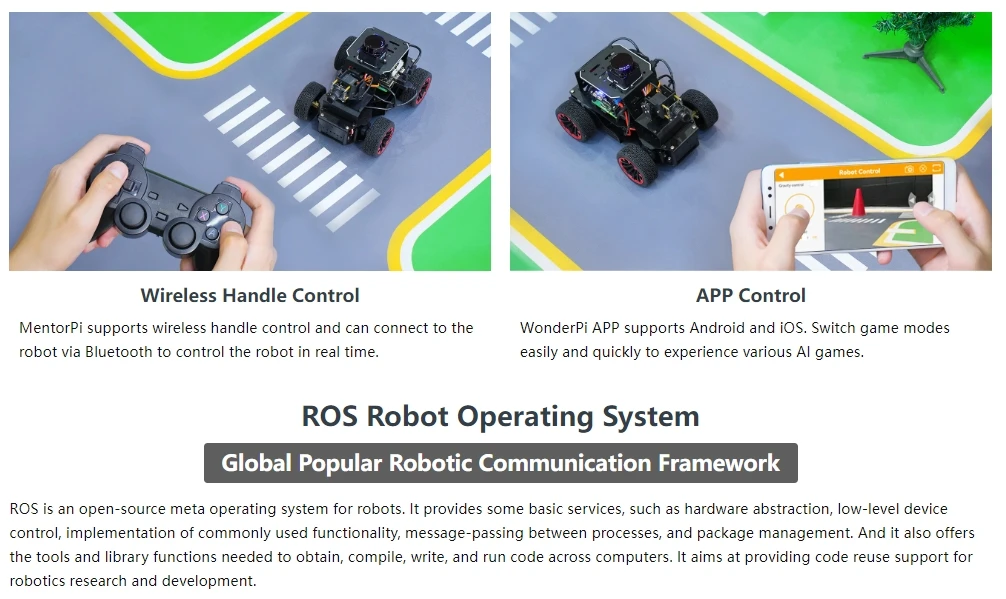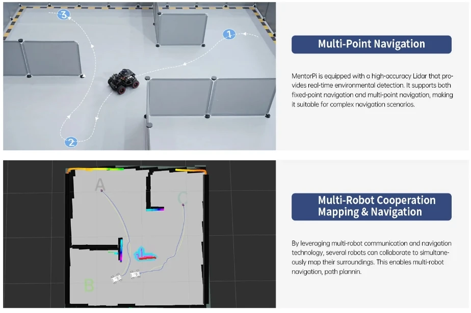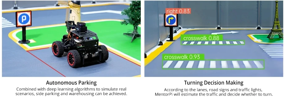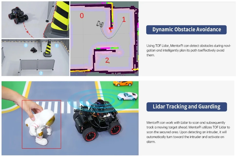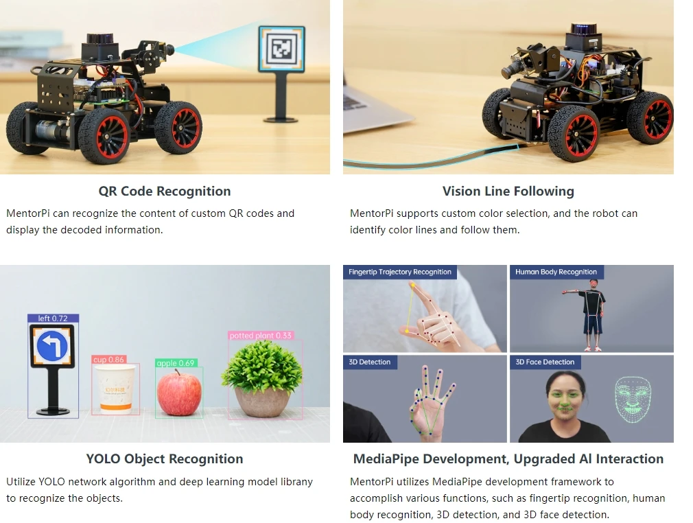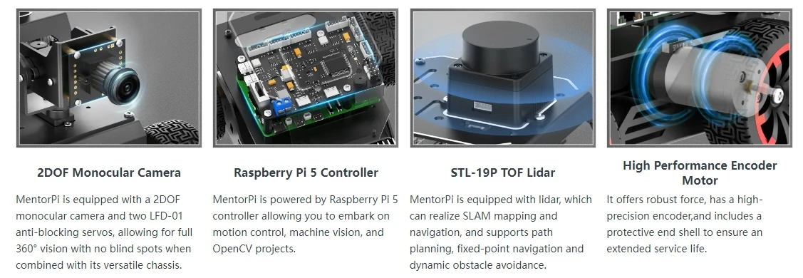 MentorPi es un automóvil robot inteligente impulsado por Raspberry Pi 5 y es compatible con ROS2. Equipado con motores codificadores de circuito cerrado de alta velocidad, Lidar, una cámara monocular 2DOF y servos de gran par, ofrece capacidades de alto rendimiento. Estos incluyen mapeo SLAM, planificación de caminos, reconocimiento de visión y conducción autónoma. Con la formación del modelo YOLOv5, MentorPi puede detectar señales de tráfico y semáforos. Hiwonder también proporciona tutoriales y vídeos detallados de ROS2 para ayudar a los usuarios a comenzar rápidamente. MentorPi es una excelente opción para robótica avanzada de IA.