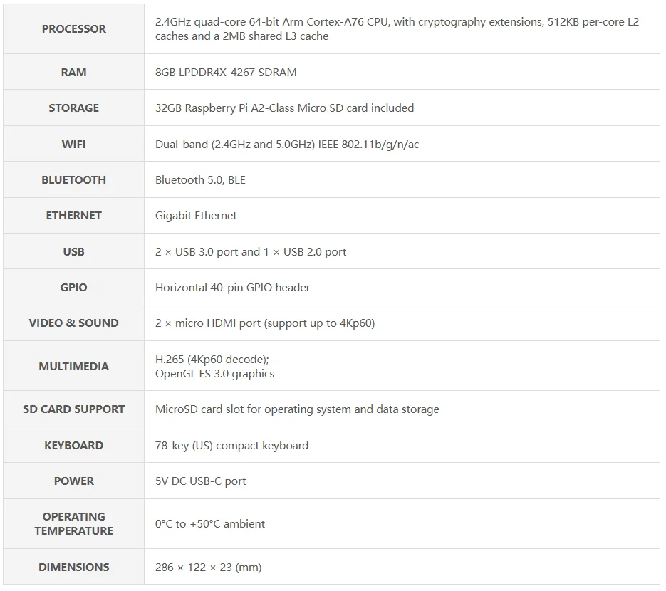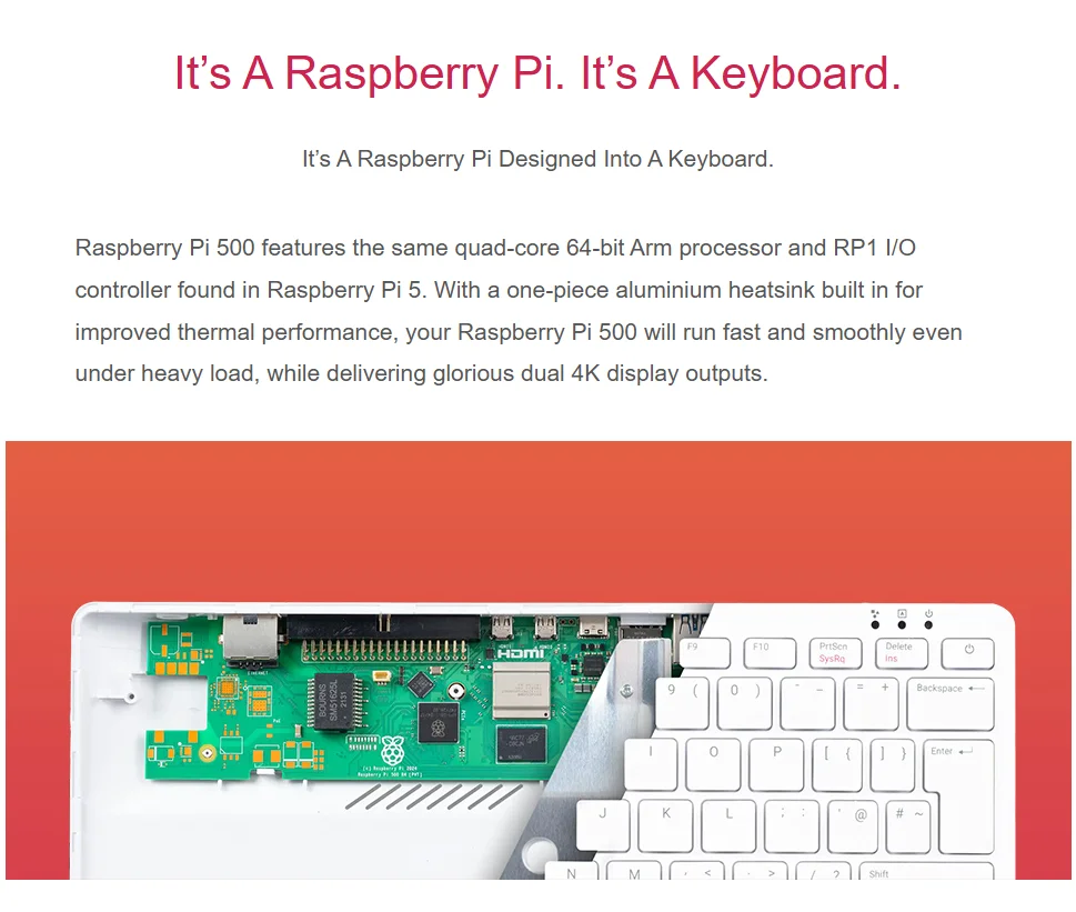 Raspberry Pi 500 cuenta con el mismo procesador Arm de cuatro núcleos y 64 bits y controlador de E/S RP1 que se encuentra en Raspberry Pi 5.Con un disipador térmico de aluminio de una sola pieza incorporado para mejorar el rendimiento térmico, su Raspberry Pi 500 funcionará rápido y sin problemas incluso bajo cargas pesadas, mientras ofrece gloriosas salidas de pantalla 4K duales.