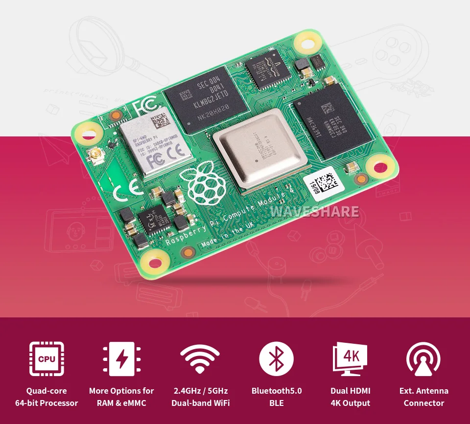 Módulo de computación Raspberry Pi 4 aprovecha la potencia de cálculo del popular Raspberry Pi 4 Modelo B, llevándolo a un factor de forma más pequeño adecuado para la integración en productos.