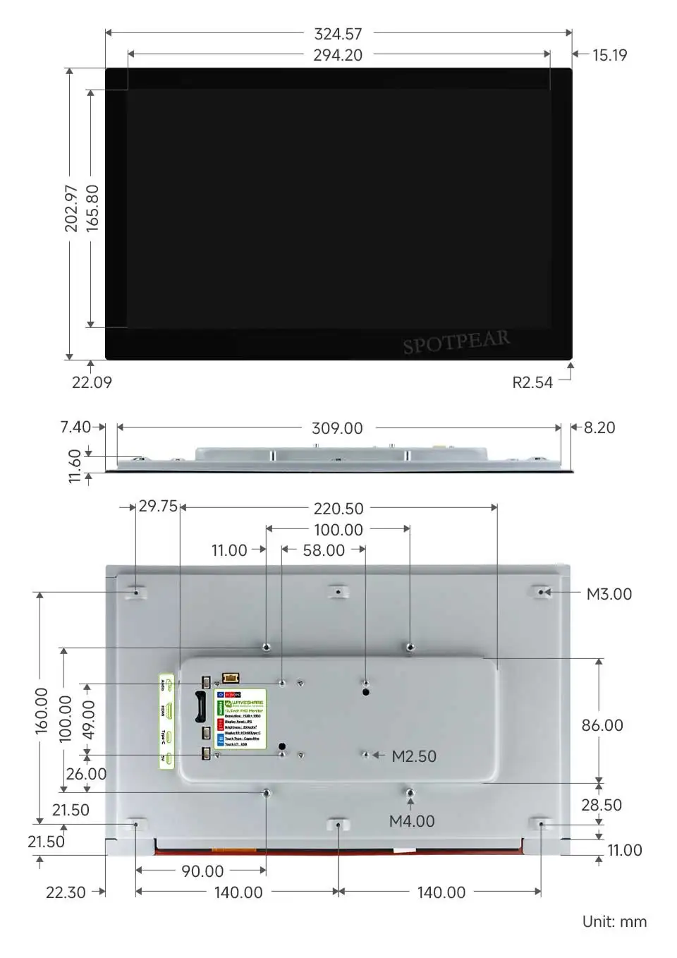 Orificios de montaje VESA M4 de 100 × 100 mm