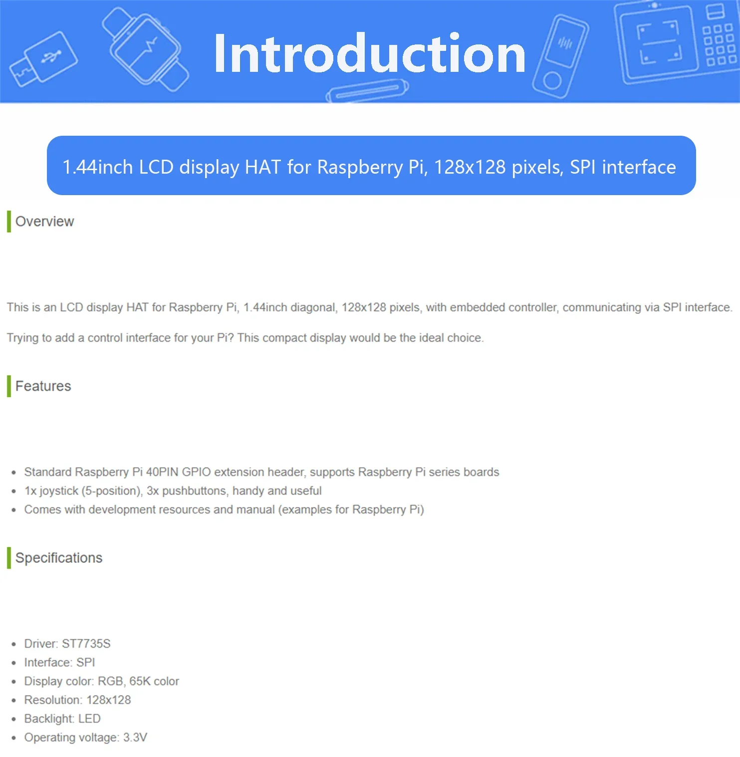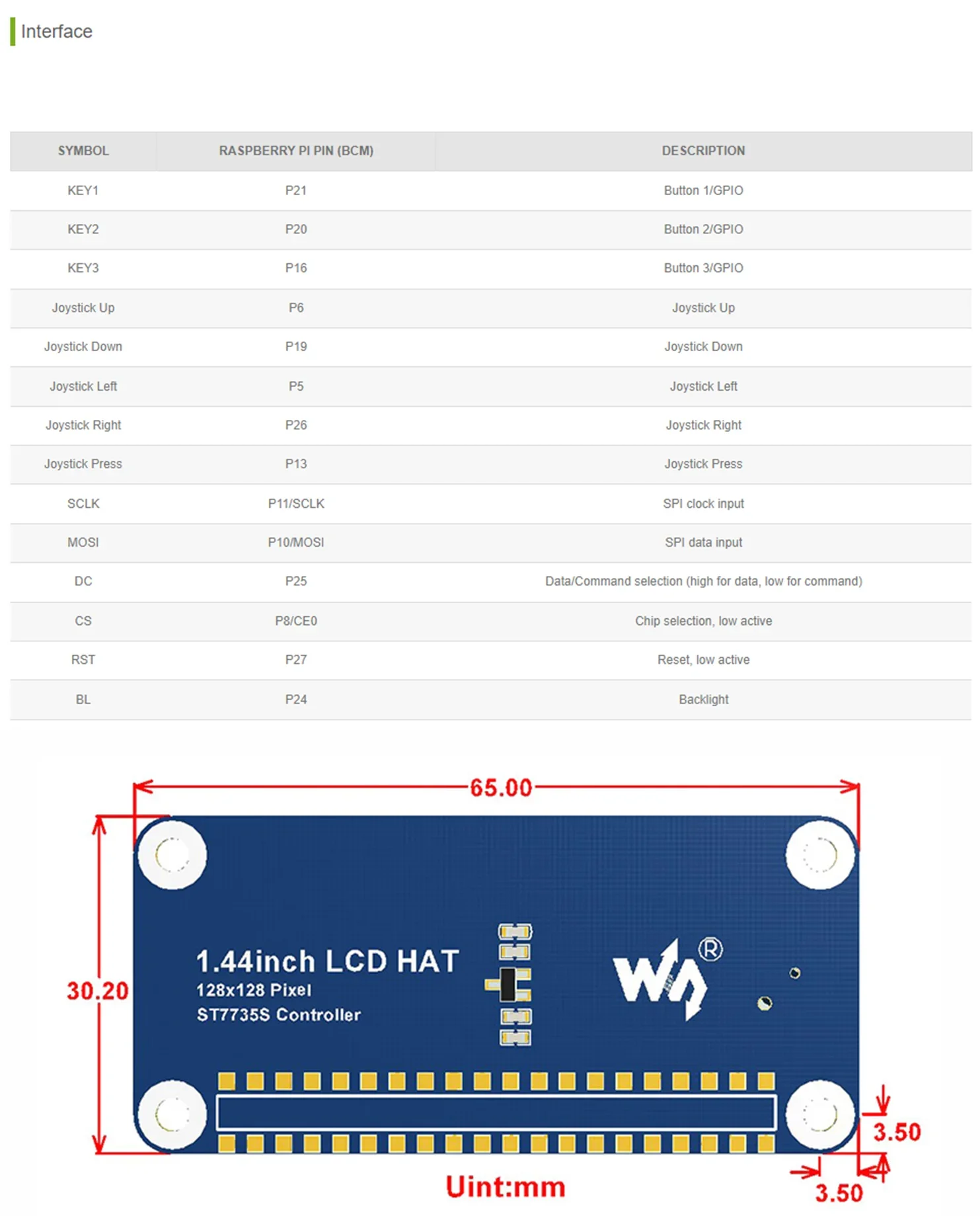 Comprar Raspberry Pi pantalla LCD de 1,44 pulgadas sombrero Waveshare para RPi 2B/3B/3B +/Zero/Zero W 128x128 píxeles interfaz SPI retroiluminación LED 3,3 V