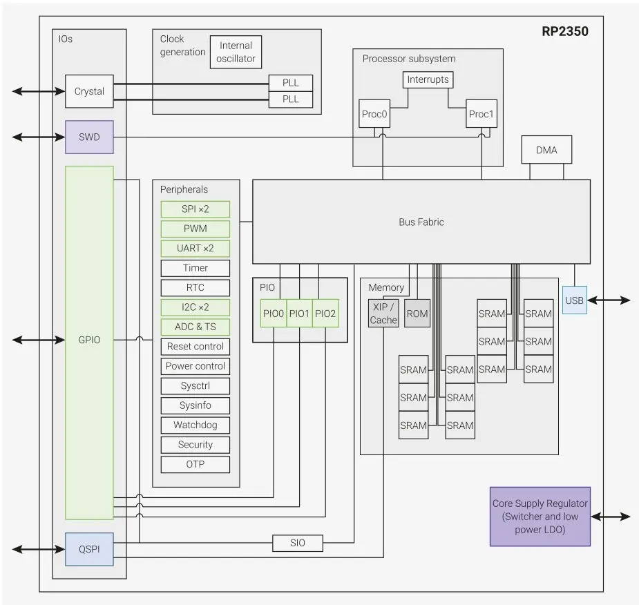 El RP2350 incorpora una CPU de doble núcleo Hazard3 RISC-V de código abierto y un Cortex-M33 de doble núcleo, pero solo se puede usar un grupo en un momento determinado.Además de los núcleos MCU más rápidos y la mayor capacidad de SRAM, el RP2350 es aproximadamente el mismo que el RP2040, aunque también agrega un bloque PIO adicional que lleva el total a tres.Una nueva característica importante es la seguridad incorporada cuando se utilizan núcleos Arm Cortex-M33 con Trustzone y otras funciones de seguridad.