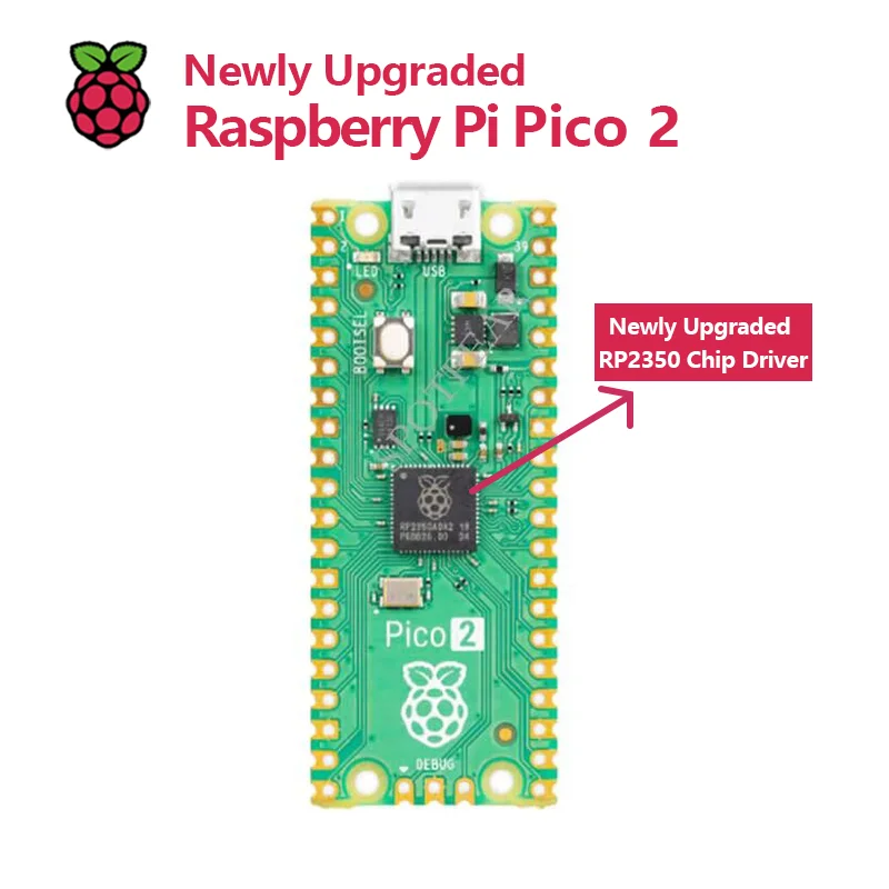 La Raspberry Pi Pico 2 es una placa de desarrollo de MCU basada en el nuevo microcontrolador RISC-V de doble núcleo Raspberry Pi RP2350 o Cortex-M33 de doble núcleo con SRAM en chip de 520 KB, un flash de 4 MB, un puerto micro USB para alimentación y programación y los mismos conectores GPIO que la placa Raspberry Pi Pico con un microcontrolador Cortex-M0+ de doble núcleo RP2040 con SRAM de 264 KB.