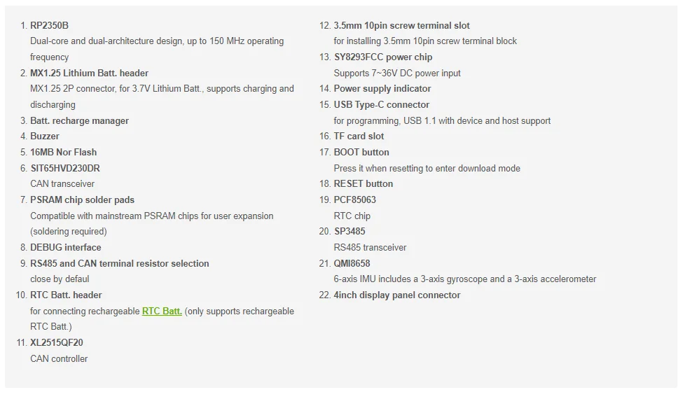 CAN integrado, RS485, interfaz I2C, IMU de 6 ejes, chip RTC y ranura para tarjeta TF, etc.