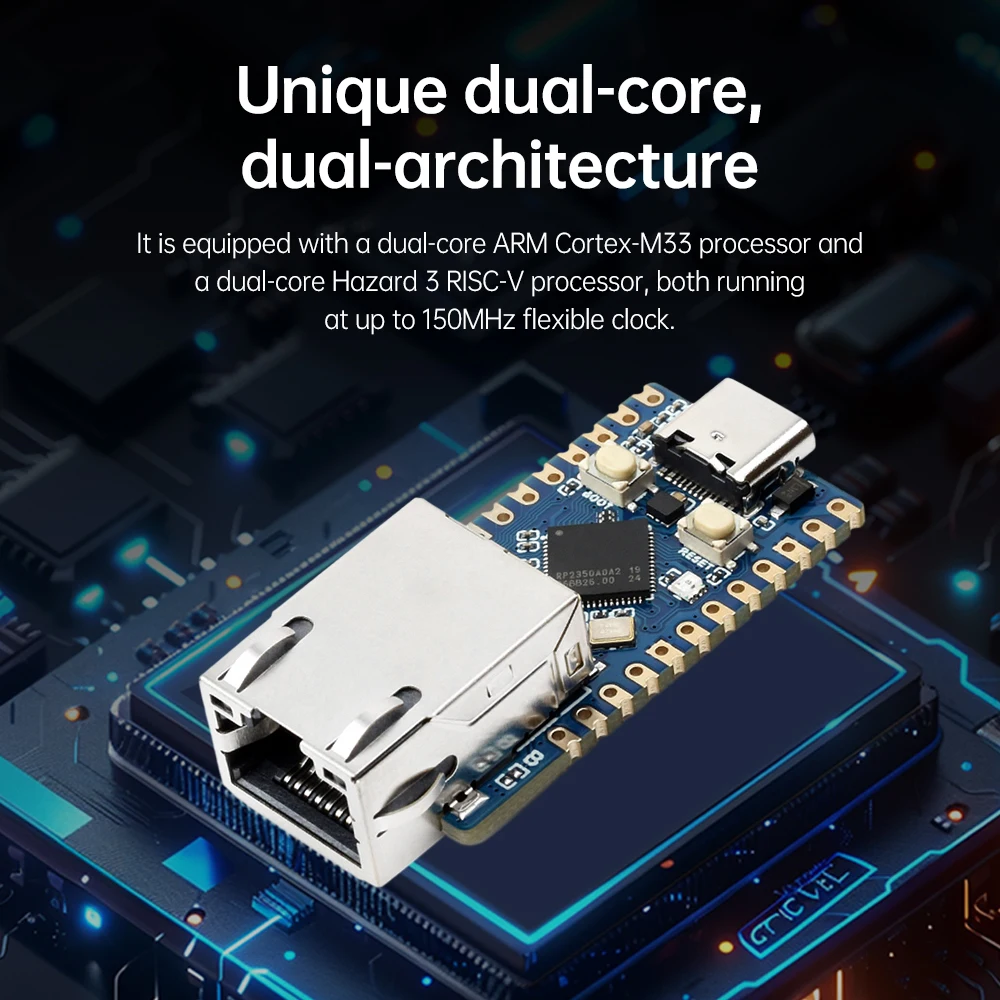 3.Único doble núcleo y arquitectura dual, equipado con procesador ARM Cortex-M33 de doble núcleo y procesador Hazard 3 RISC-V de doble núcleo, ambos funcionando a una frecuencia de reloj flexible de hasta 150 MHz.