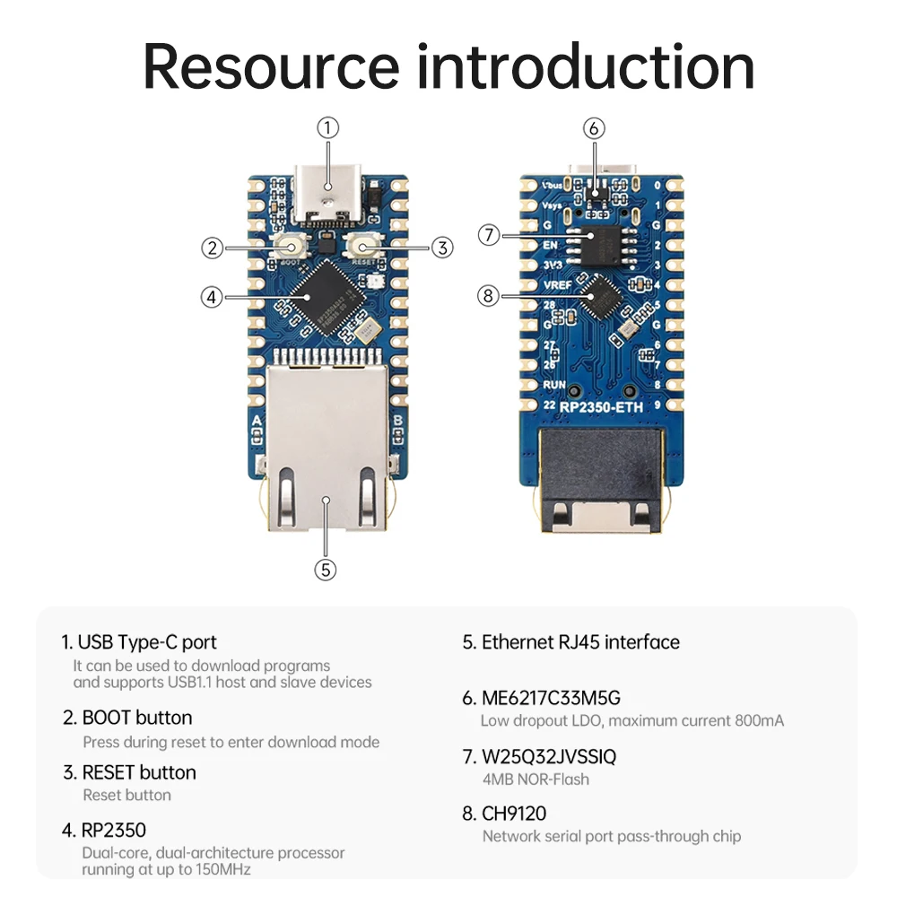 1.Este RP2350-ETH está desarrollado en base a RP2350 y viene con una interfaz ETH integrada, lo que facilita su uso.