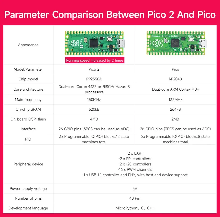 Performance Boost: Pico 2 tiene una velocidad de reloj de hasta 150 MHz, en comparación con 133 MHz en Pico 1.