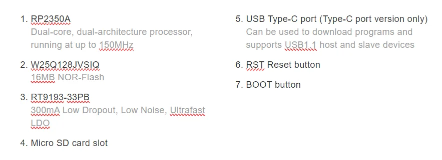 Exclusiva arquitectura dual-core y dual, equipada con un procesador ARM Cortex-M33 de doble núcleo y un procesador Hazard3 RISC-V de doble núcleo, ambos funcionando a frecuencias de reloj de hasta 150 MHz.