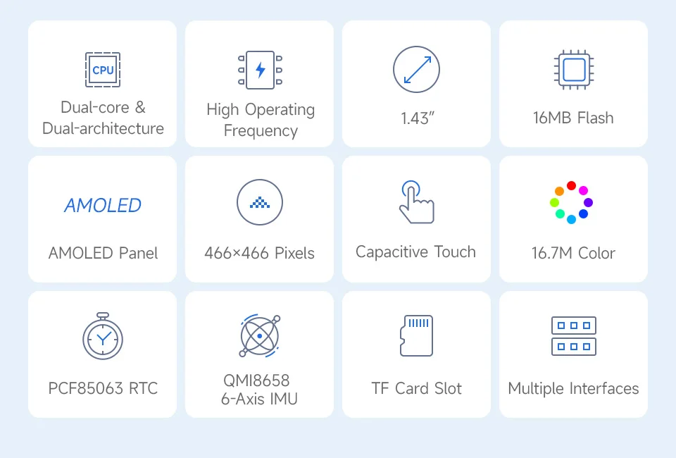 IMU integrada de 6 ejes QMI8658 (acelerómetro de 3 ejes y giroscopio de 3 ejes) para detectar gestos de movimiento, conteo de pasos, etc.