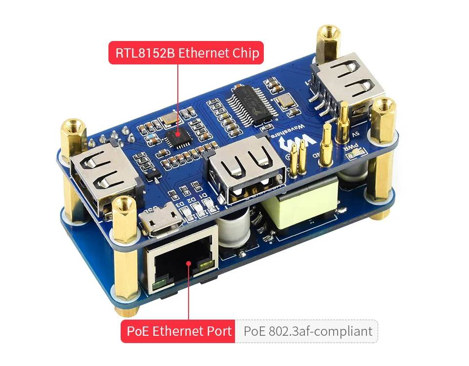 El SOMBRERO HUB PoE/ETH/USB Es Un SOMBRERO HUB USB PoE (Power over Ethernet) diseñado para Raspberry Pi Cero... Al usar este pequeño HAT y algunos equipos de abastecimiento de energía compatibles con 802.3af, es posible proporcionar y fuente de alimentación para conexión de red su Raspberry Pi en un solo cable Ethernet, junto con 3x puertos USB extendidos...