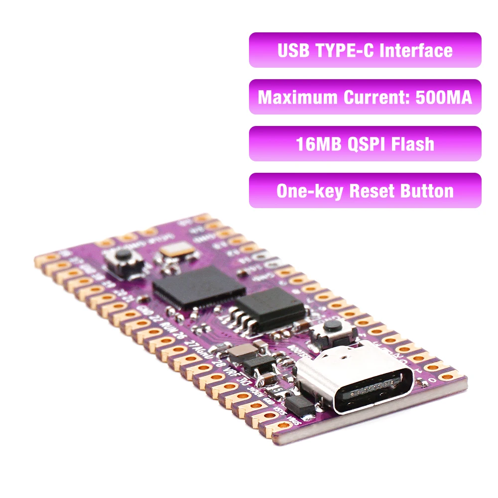 La placa es una placa de microcontrolador basada en el chip de microcontrolador Raspberry Pi RP2040. Ha sido diseñado para ser una placa microcontroladora de bajo costo y alto rendimiento con interfaces digitales flexibles. La placa cuenta con dos núcleos ARM de hasta 133MHz; 256KB RAM; 30 pines GPIO; y una amplia gama de opciones de interfaz. Esto se combina con 16MB de memoria Flash QSPI integrada para almacenamiento de código y datos. Corriente máxima de funcionamiento de hasta 500 mA. Es compatible con Raspberry Pi Official Rasberry Pi Official C/C ++ SDK, Micro Python SDK.