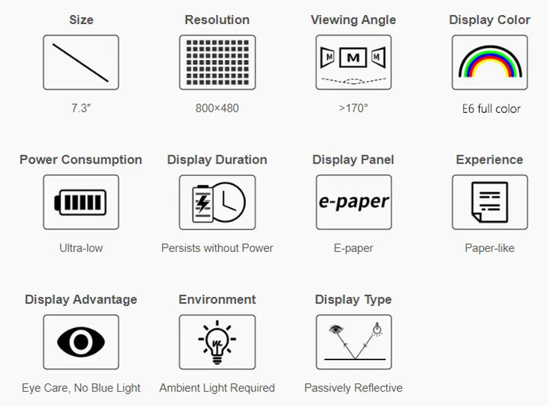 [] La pantalla utiliza tecnología E Ink Spectra 6 (E6), que admite efectos de visualización en color de alto contraste y alta saturación.