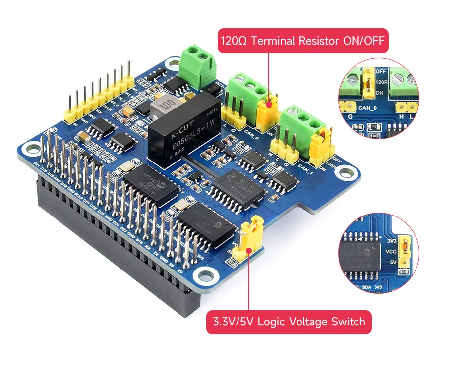 [] Seleccione fácilmente el voltaje de funcionamiento de 3,3 V / 5V, o active/desactive la resistencia terminal de 120Ω, a través de puentes integrados