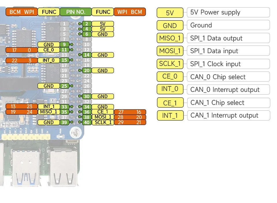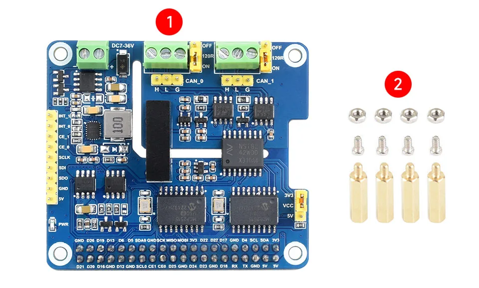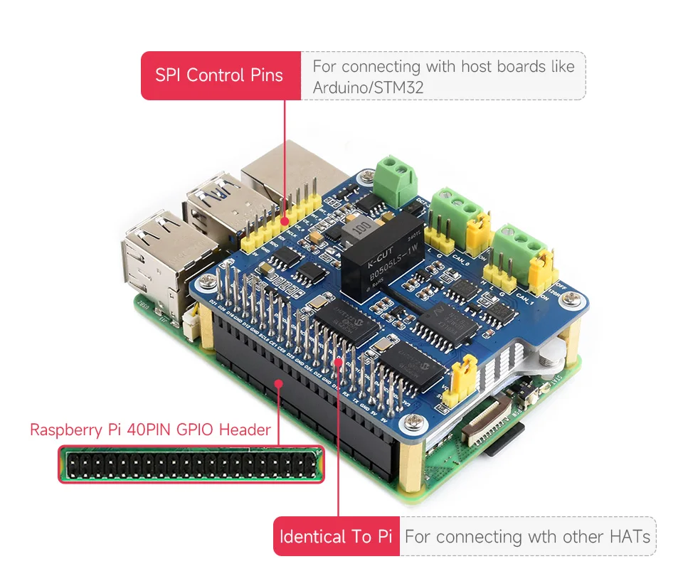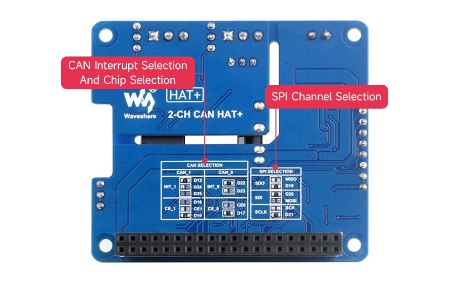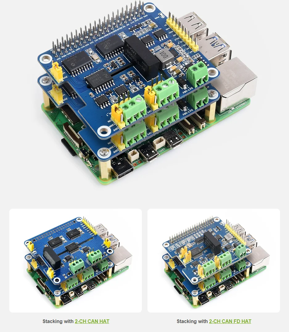 [] Soporte de comunicación de bus CAN multicanal, con almohadillas de soldadura reservadas en la parte posterior para selección de chip de canal CAN y selección de PIN de interrupción. Admite el apilamiento de dos de este módulo para expandir el bus CAN de 4 canales, y se puede apilar directamente con 2-CH CAN HAT o 2-CH CAN FD HAT, lo que permite una expansión flexible para varios escenarios de aplicación CAN