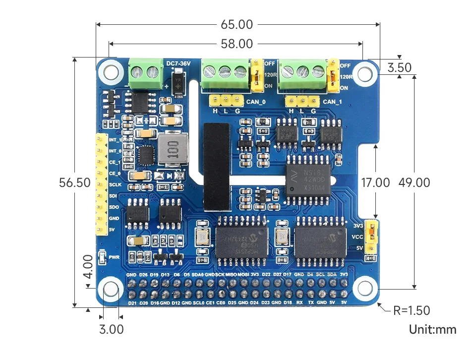 [] Adopta la solución combinada de chips duales MCP2515 y SN65HVD230, permite la comunicación CAN de 2 canales