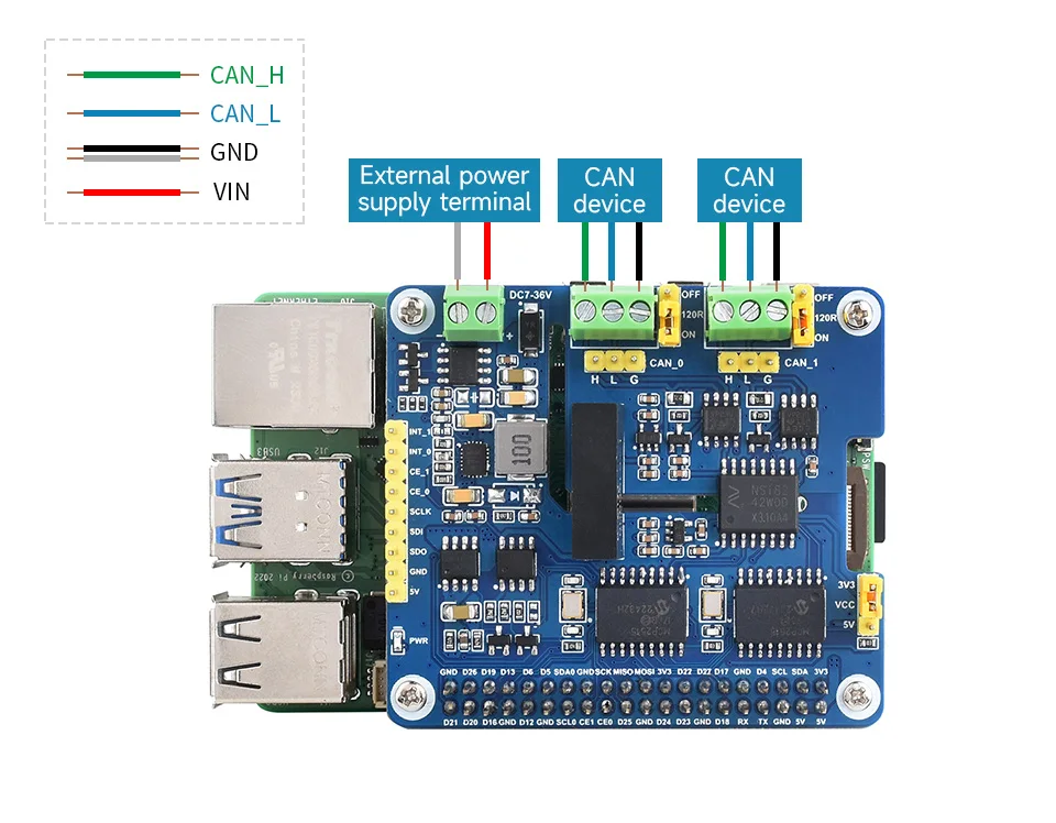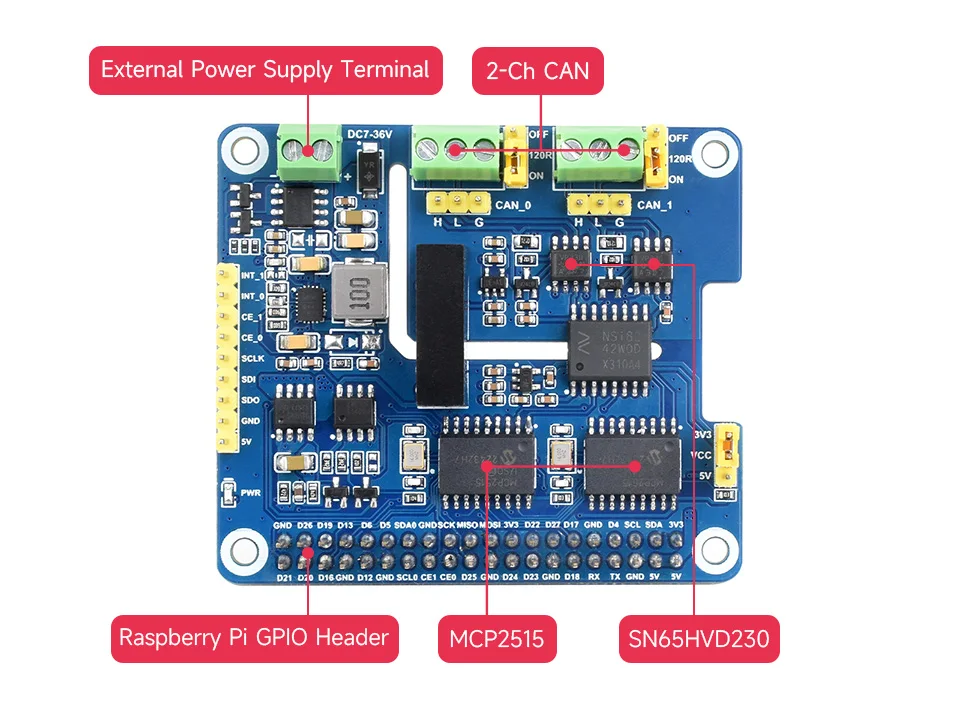 [] El 2-CH CAN HAT + es un HAT de expansión de bus CAN de 2 canales diseñado para Raspberry Pi. Admite la expansión de múltiples canales CAN apilando con 2-CH CAN HAT o 2-CH CAN FD HAT. Adopta el diseño estándar HAT +, compatible con placas de la serie Raspberry Pi como Raspberry Pi 5/4/3/Zero. Varios circuitos de protección integrados, incluido el aislamiento eléctrico para que la comunicación sea más segura y fiable. Admite una entrada de voltaje de amplio rango de 7 ~ 36V, adecuado para aplicaciones industriales.