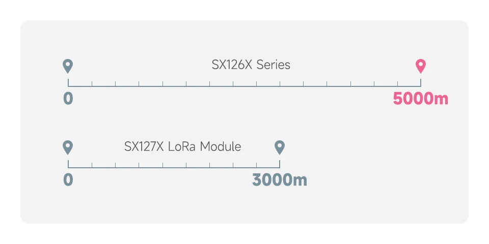 The LoRa spread spectrum transmission distance of the SX126X series is up to 5000m, which is 65% longer than the SX127X LoRa module with the same power