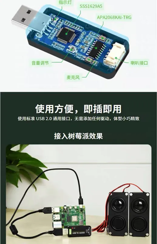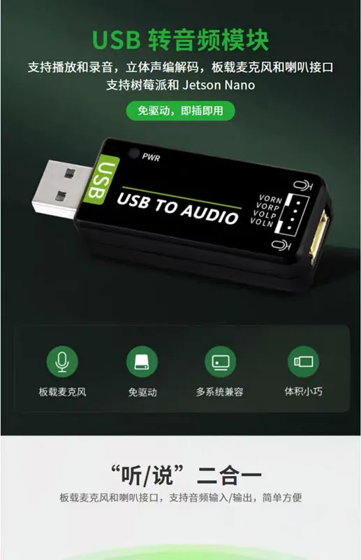 Para Raspberry Pi/JetsonNano USB a módulo de audio, sin tarjeta de sonido de unidad, micrófono/altavoz integrado capaz de reproducir/grabar sonido estéreo