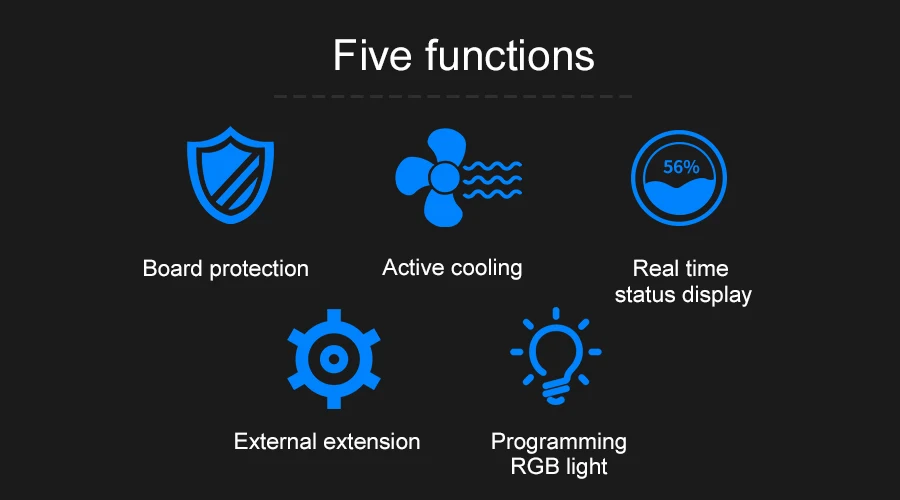 Funciones principales: disipación activa del calor, extensión del pin externo, luz de programación RGB, protección de la placa base (solo pantalla OLED con versión estándar)
