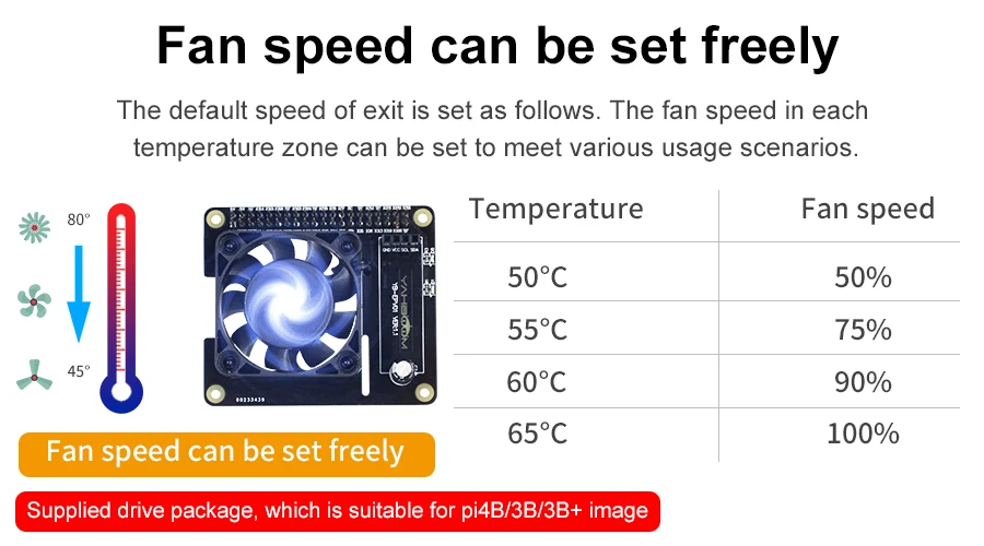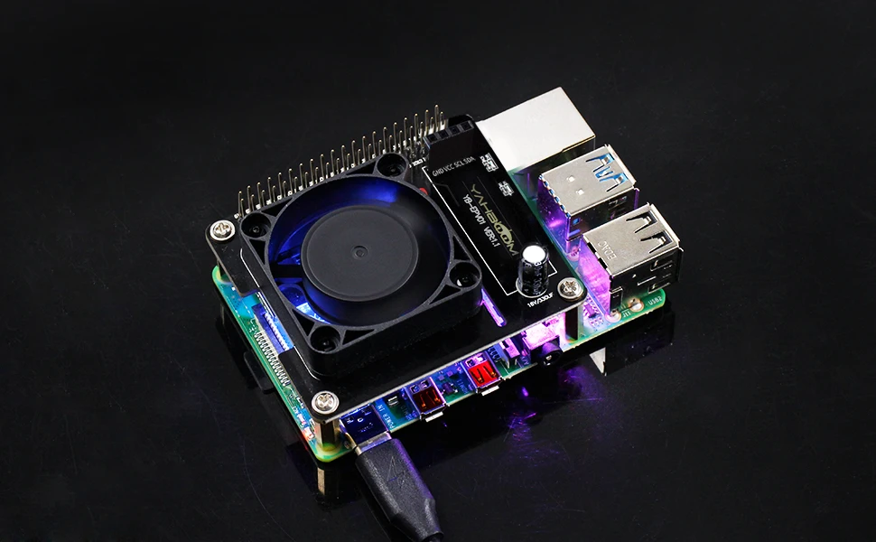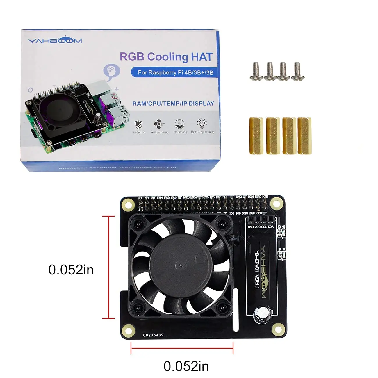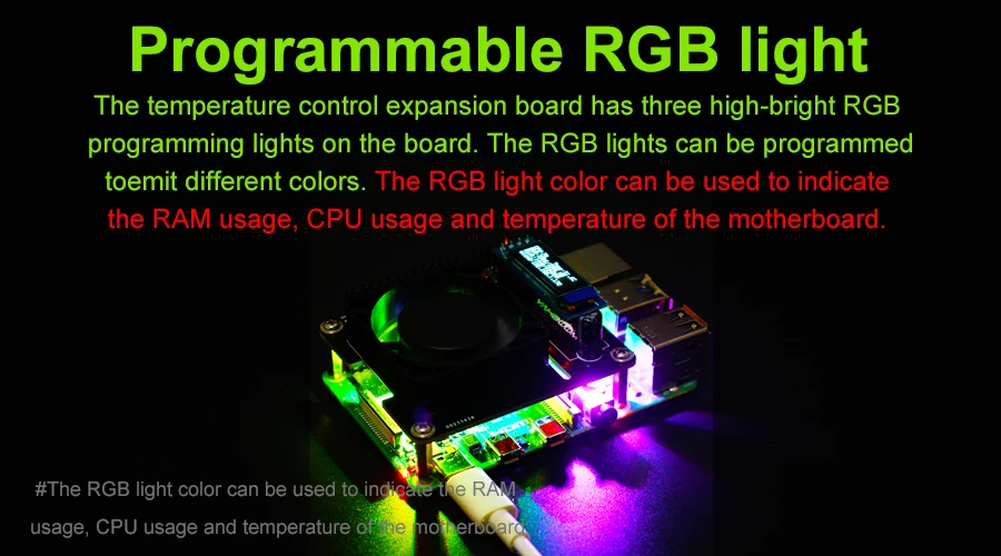 Esta es una placa de expansión de refrigeración multifunción diseñada para la placa Raspberry Pi. Es perfectamente compatible con 4B/3B +/3B para proteger Raspberry Pi y prolongar su vida útil. El ventilador de refrigeración de gran tamaño en la placa con fuerte energía eólica puede hacer que Raspberry Pi funcione de manera más estable ajustando automáticamente la velocidad de acuerdo con la temperatura de la CPU. 3 luces de programación RGB de alto brillo en la parte inferior de la placa de expansión, que pueden realizar las siguientes luces, luces de respiración, marquesinas, etc. También expande el encabezado de 40 Pines de Raspberry Pi y se puede usar para conectarse a otros dispositivos. Proporcionaremos un paquete de controladores para todas las imágenes de Raspberry Pi, que es conveniente para que los usuarios conduzcan ventiladores, pantallas OLED, luces RGB.