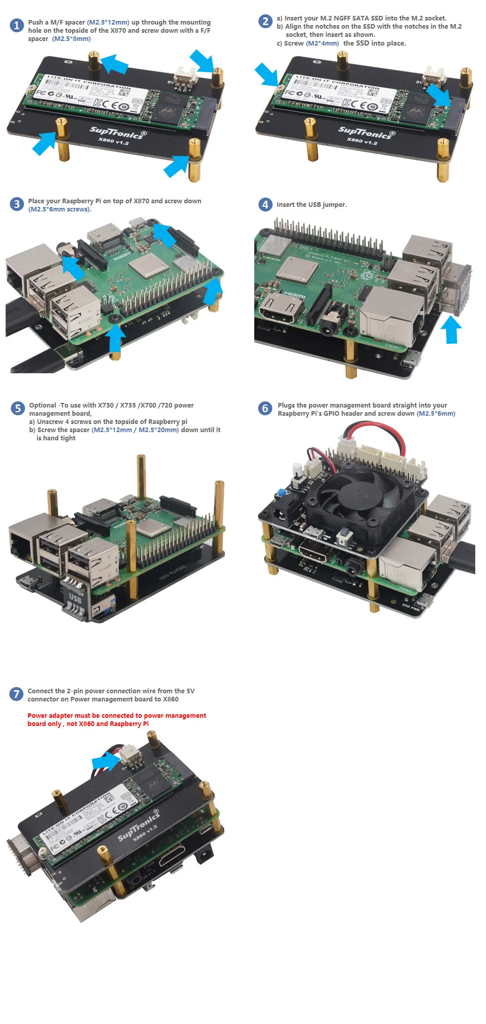 Este protector SSD X860 M.2 NGFF SATA proporciona una solución de almacenamiento completa para Raspberry Pi,Admite unidad de estado sólido SSD m.2 NGFF de hasta 2 TB.