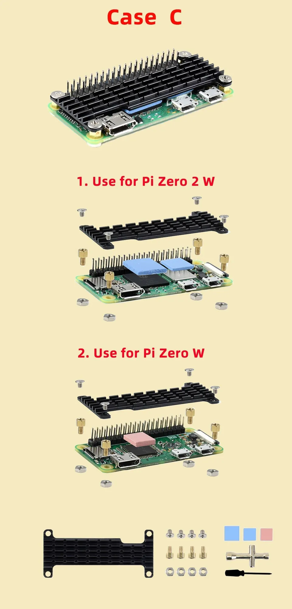 Caja de aluminio Raspberry Pi Zero 2 W, disipador de calor de refrigeración pasiva, almohadilla térmica de silicona con destornillador para Pi Zero 2 W/Zero W/Zero 1.3