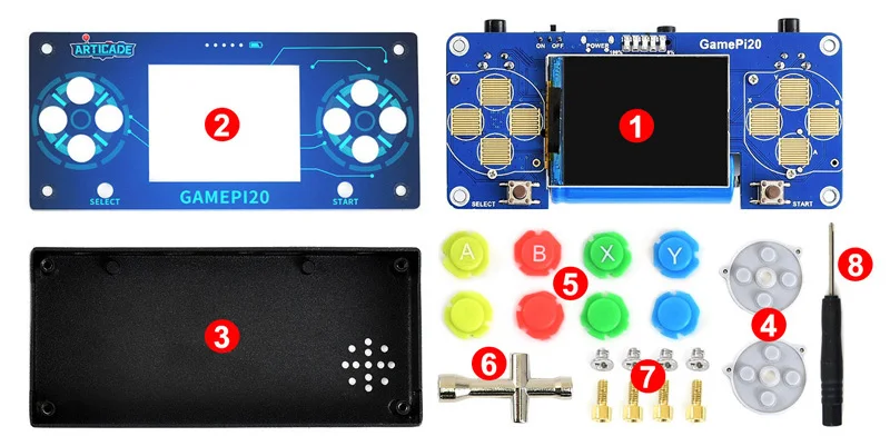Este paquete de accesorios incluye complementos necesarios para construir su propio GamePi20, extracto de Raspberry Pi y tarjeta micro SD.
