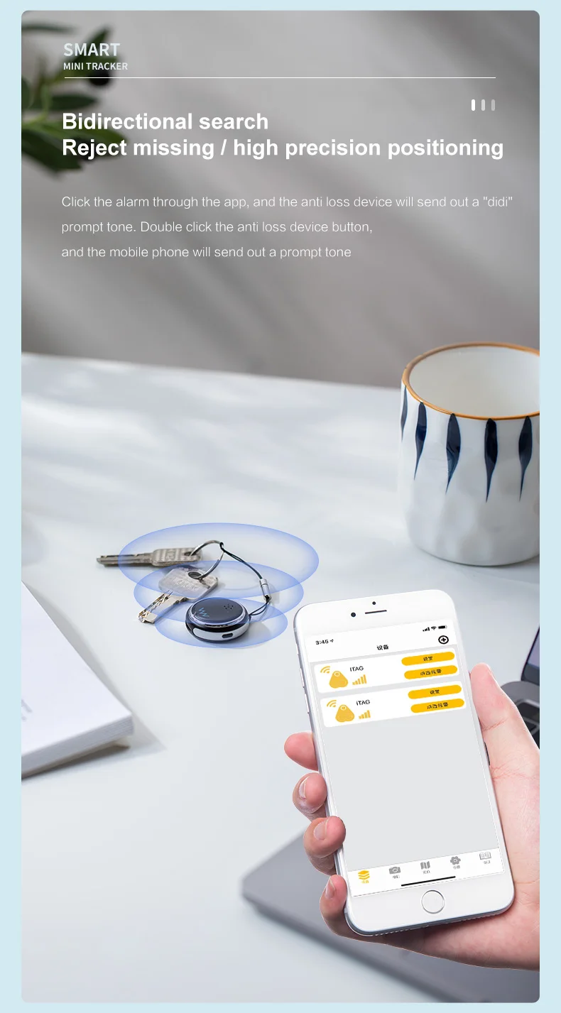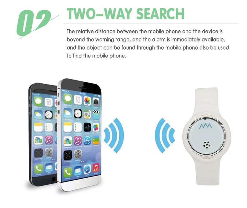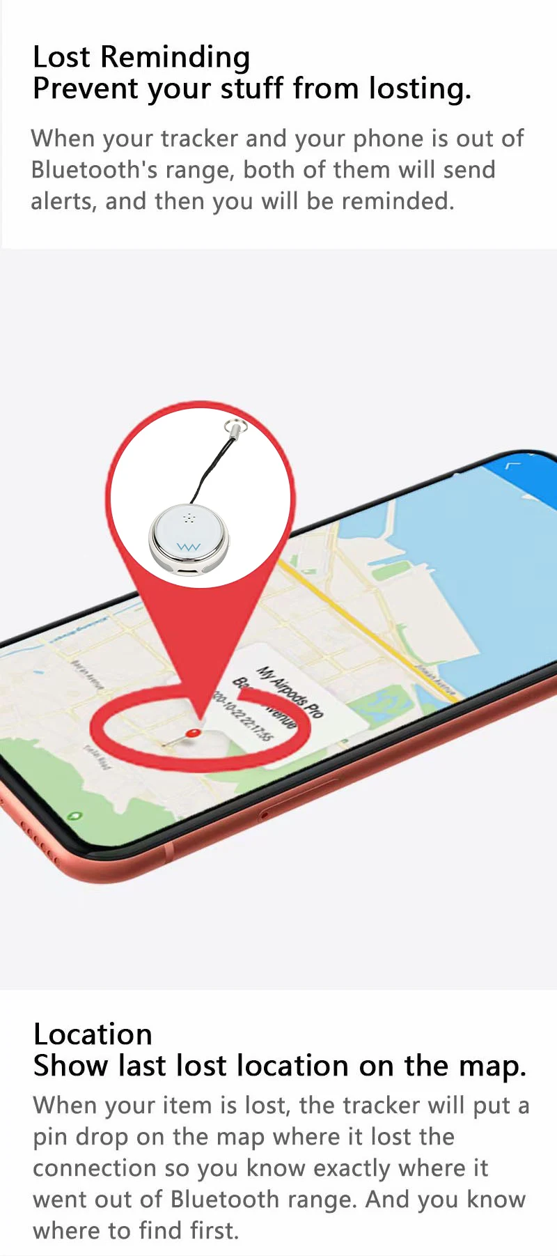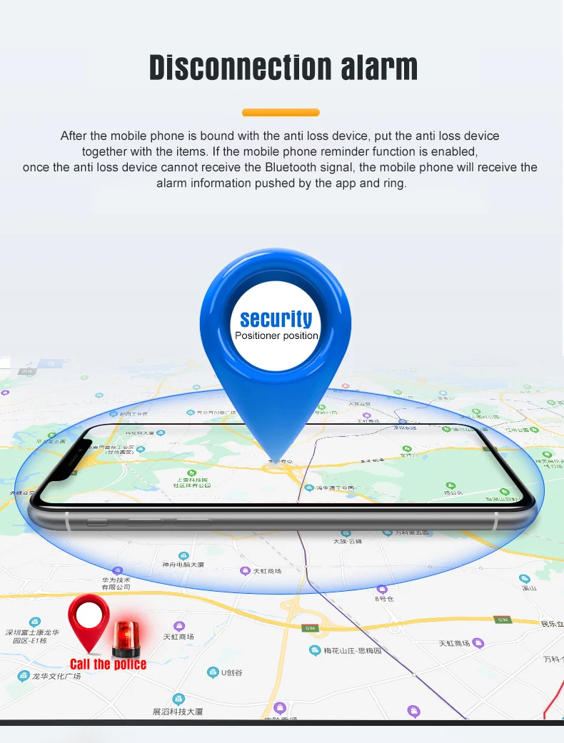 Alarma bidireccional: cuando su teléfono móvil está conectado al dispositivo antipérdida, si solo trae su teléfono móvil cuando sale, y deje el dispositivo antipérdida a unos 10 metros de distancia, el teléfono móvil y el llavero le alertarán.