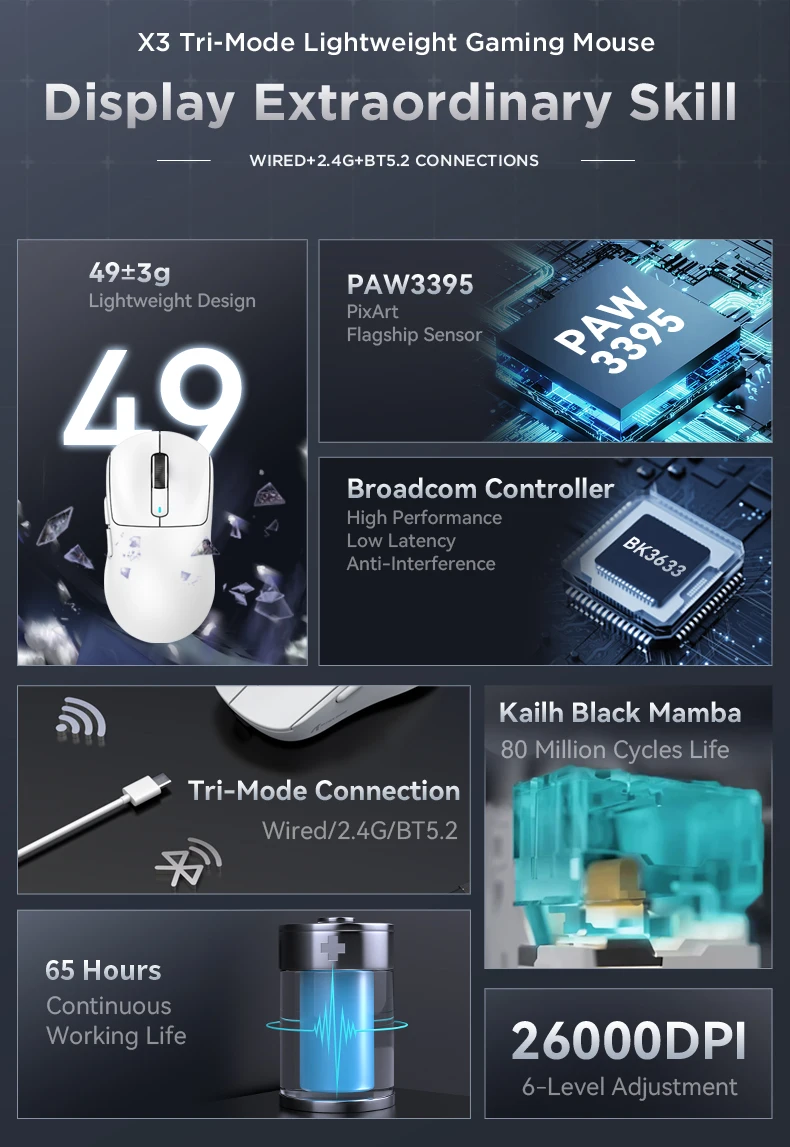 Parámetros del producto: Modelo: X3 Conexión: Con cable/2.4G/BT5.2 Tamaño: 118,5x61x39,7mm DPI: 800-26000 ppp Peso: 49 g ± 3 g Tasa de retorno: 125-1000Hz Sensores de imagen: PixArt PAW3395 Interruptor Kailh: Mamba negra 80 millones de veces Capacidad de la batería: 300 mAh Vida laboral: 65H Velocidad acelerada: 50G Velocidad de movimiento: 650IPS