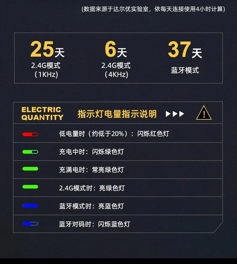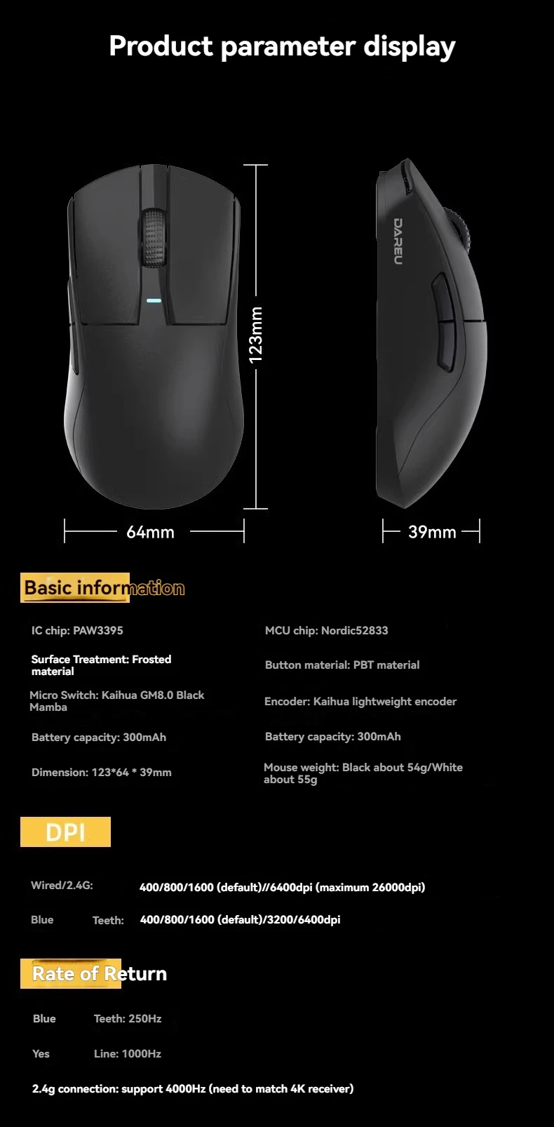 2.Equipado con el excelente sensor PAW3395, realiza una tasa de retorno inalámbrica de hasta 8000 Hz, sensación de latencia de luz ultrabaja, cuidadosamente diseñado para crear una experiencia de juego increíblemente rápida, lo que permite a los usuarios sumergirse en el mundo de los juegos donde la velocidad extrema. y la precisión coexisten.