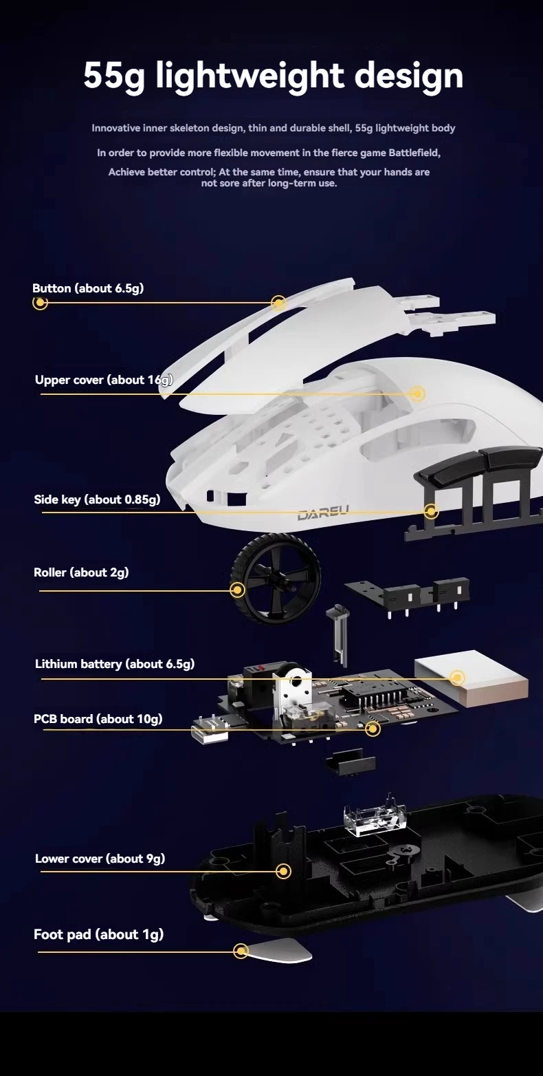 1.Aproximadamente 55 gramos de diseño ultraligero, el uso de materiales avanzados, diseño estructural y medios de detalle, para lograr un importante efecto de reducción de peso, para que el usuario brinde una experiencia un uso más relajado y cómodo.