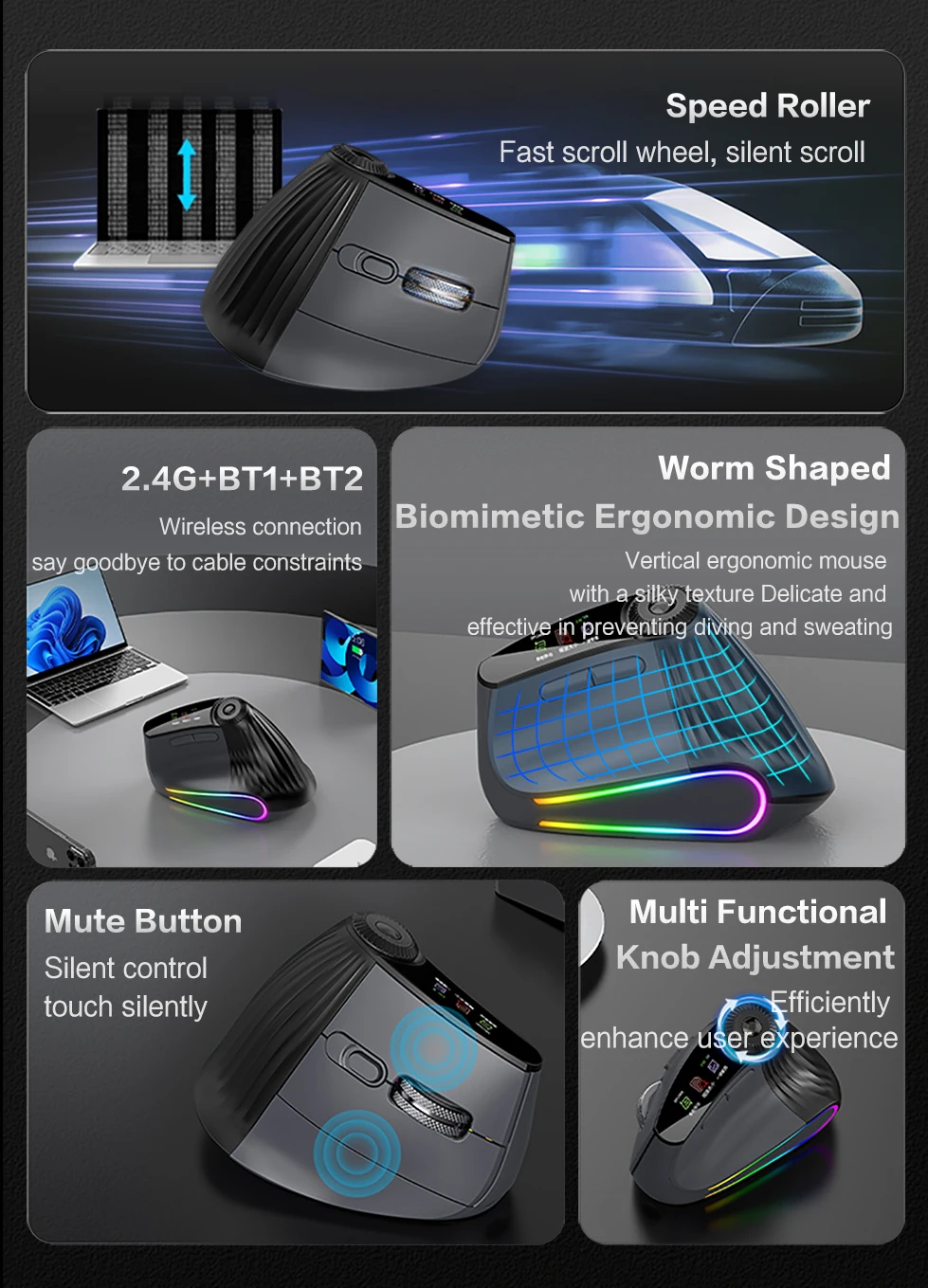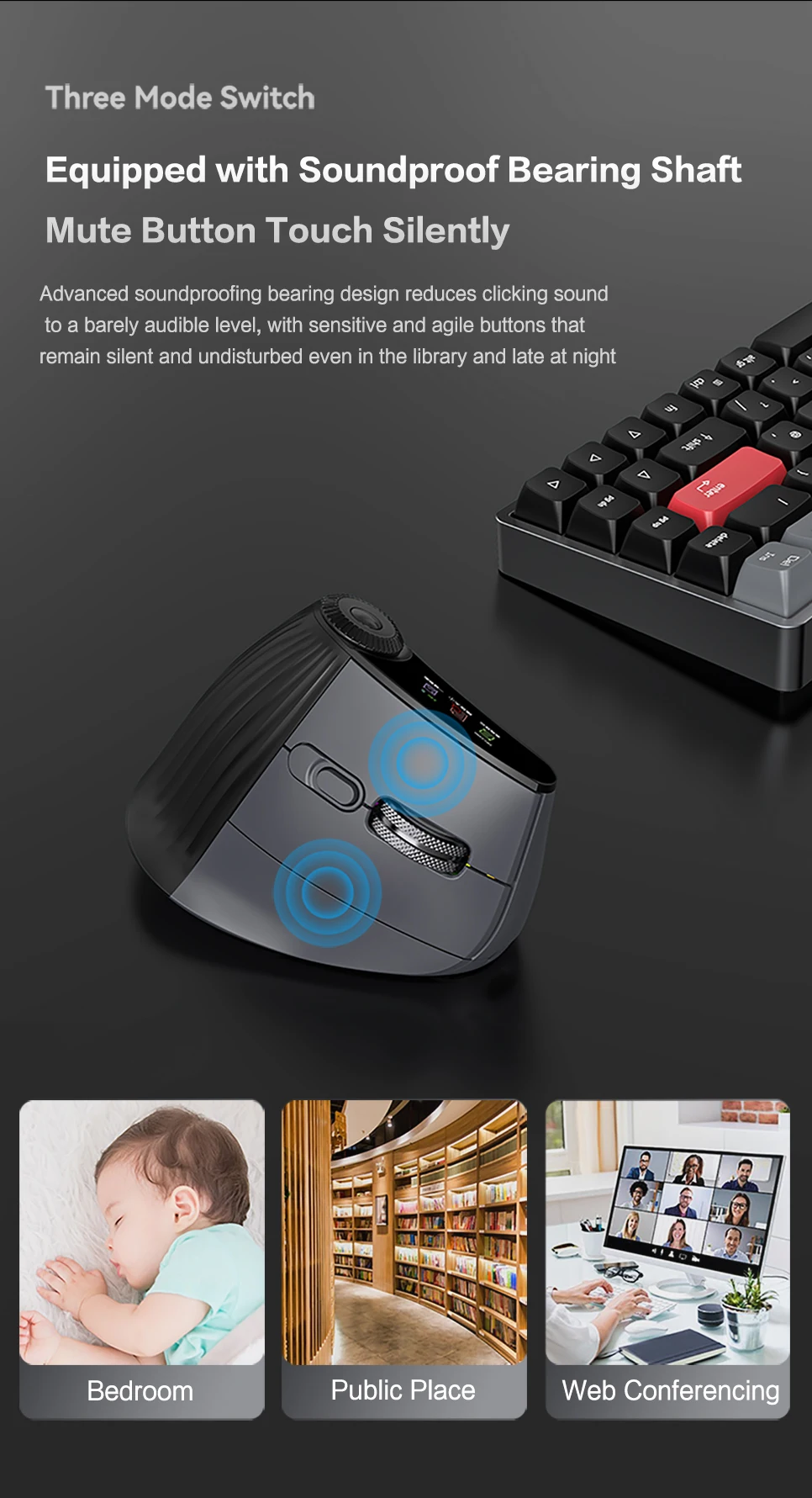 Agarre vertical: Construido con ergonomía para un agarre vertical, soporta fácilmente la palma y el brazo, aliviando la fatiga.A diferencia del agarre horizontal común del mouse (evitando la suspensión de la muñeca y la compresión del brazo), es más cómodo para un uso prolongado y ayuda a prevenir la "mano del mouse".