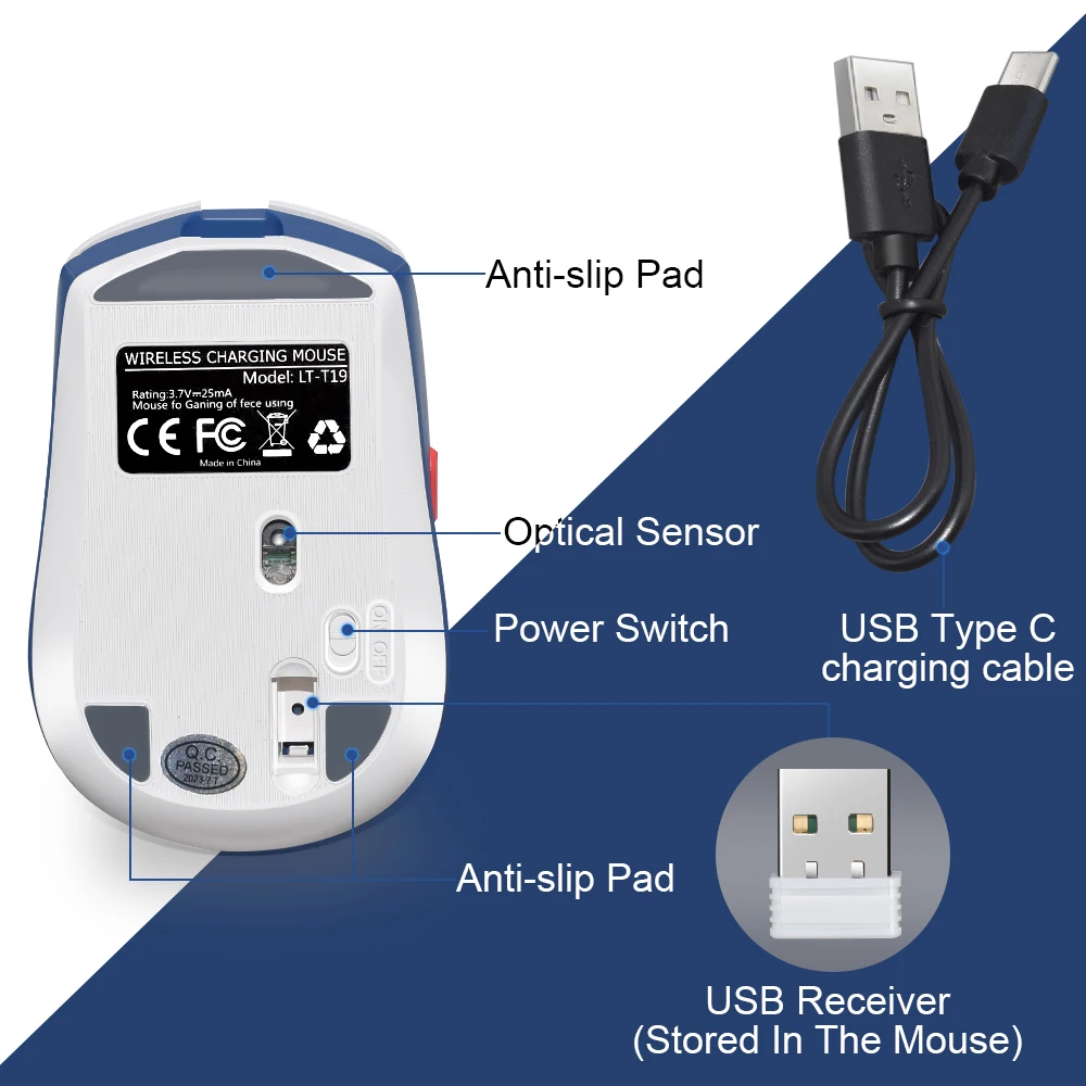 LT-T19 Ratón ergonómico recargable para juegos USB 2,4G, luz RGB inalámbrica, PC de escritorio, ordenadores, portátiles y portátiles