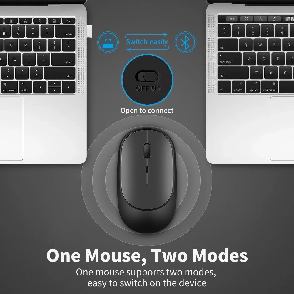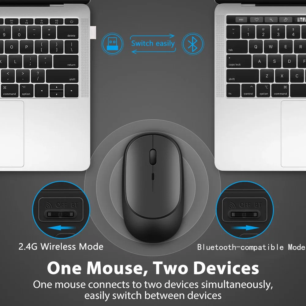 Características:[RATÓN BT MODO DUAL]Modo A: Inserte el receptor USB en el puerto USB y cambie el interruptor del ratón a 2,4G.Modo B: cambia el interruptor del ratón a BT, presiona el botón de emparejamiento durante 2-3 segundos, el ordenador BT encontrará el ratón y lo emparejará.[3 tipos de DPI ajustables]Resoluciones 800/1200/1600 DPI (1600 por defecto). Ajuste fácilmente el botón DPI para ajustar instantáneamente la velocidad del ratón a diferentes escenarios de trabajo con el botón DPI en la parte superior del ratón inalámbrico.[Ratón silencioso inalámbrico]La tecnología de transmisión inalámbrica proporciona una conexión potente y fiable hasta 10m. Las características del ratón 90% de reducción de ruido, te ayudan a concentrarte en tu trabajo, estudiar sin molestar a otros aparte de ti. Nota: el botón DPI no es silencioso.[Diseño cómodo de ahorro de energía]Una Hora de Carga puede funcionar durante un mes.[Amplia compatibilidad]El ratón es compatible con Macbook, PC, iPad, ordenador y teléfono móvil. 2,4G se puede utilizar con ordenadores portátiles y cualquier dispositivo con puertos USB.[Nota: el receptor USB se almacena en la caja de la batería del ratón.]Especificaciones:Nombre del artículo: Ratón inalámbricoBotones: 4 botonesVersión compatible con Bluetooth: BT 5,0Interruptor DPI ajustable: 800 /1200 /1600DPIRango de conexión: 10MFuente de alimentación: batería recargable integrada de 500mAhLongitud del cable de carga: aproximadamente 35-45cmVida del interruptor: 10 millones de vecesTamaño: 108*60*27mmContenido del paquete1 ratón inalámbrico1 receptor USB1 x cable de cargaO1 ratón inalámbrico1 receptor USB1 x cable de carga1 x USB 3,0 a adaptador OTG tipo C