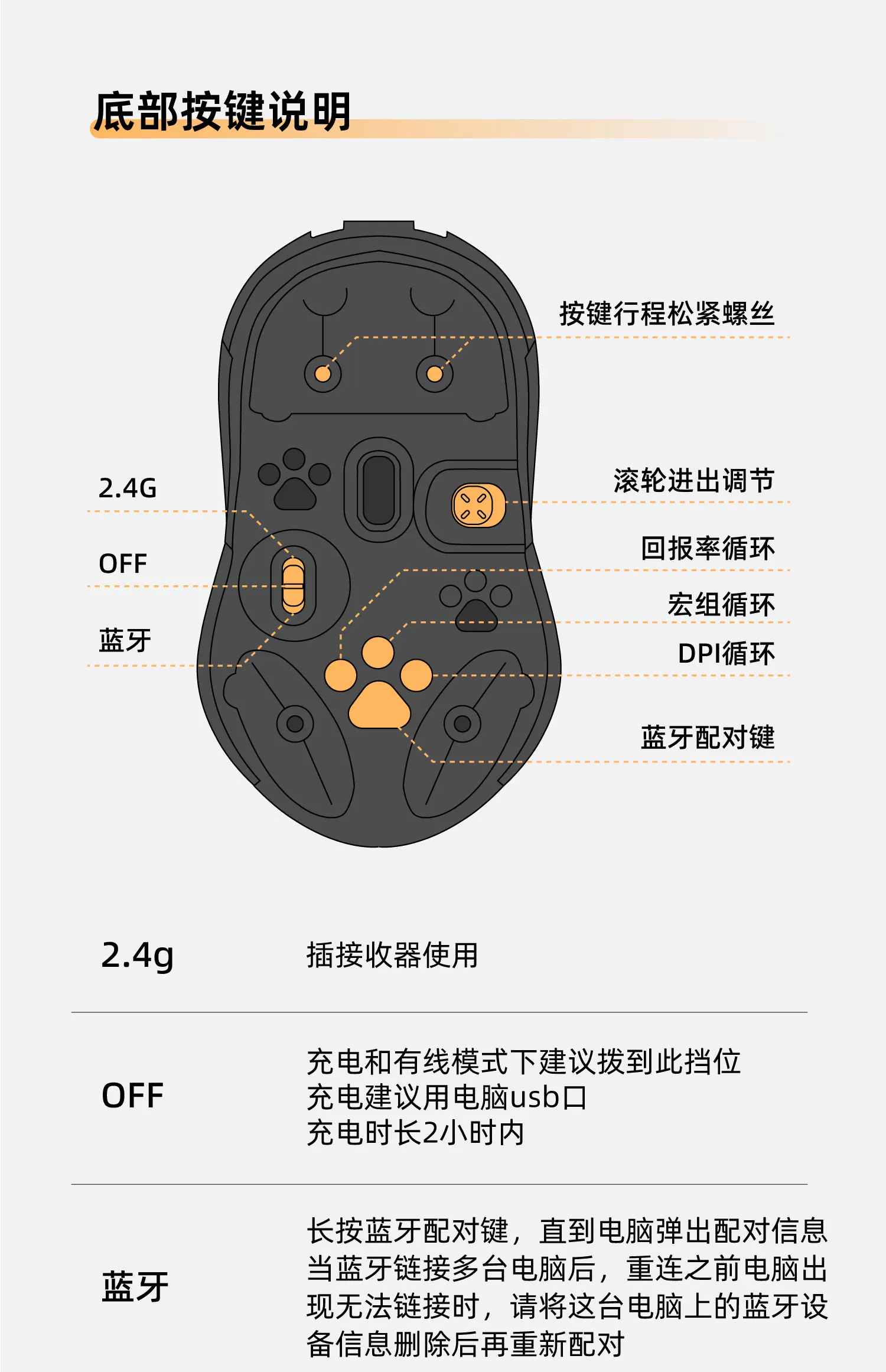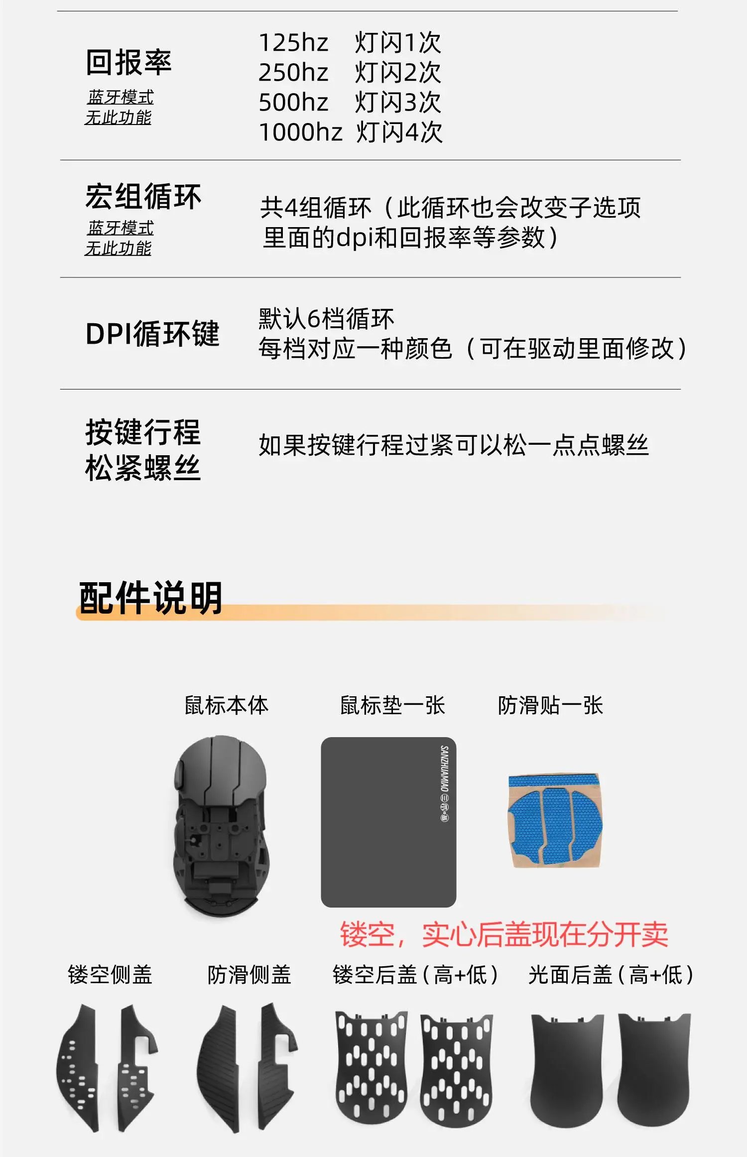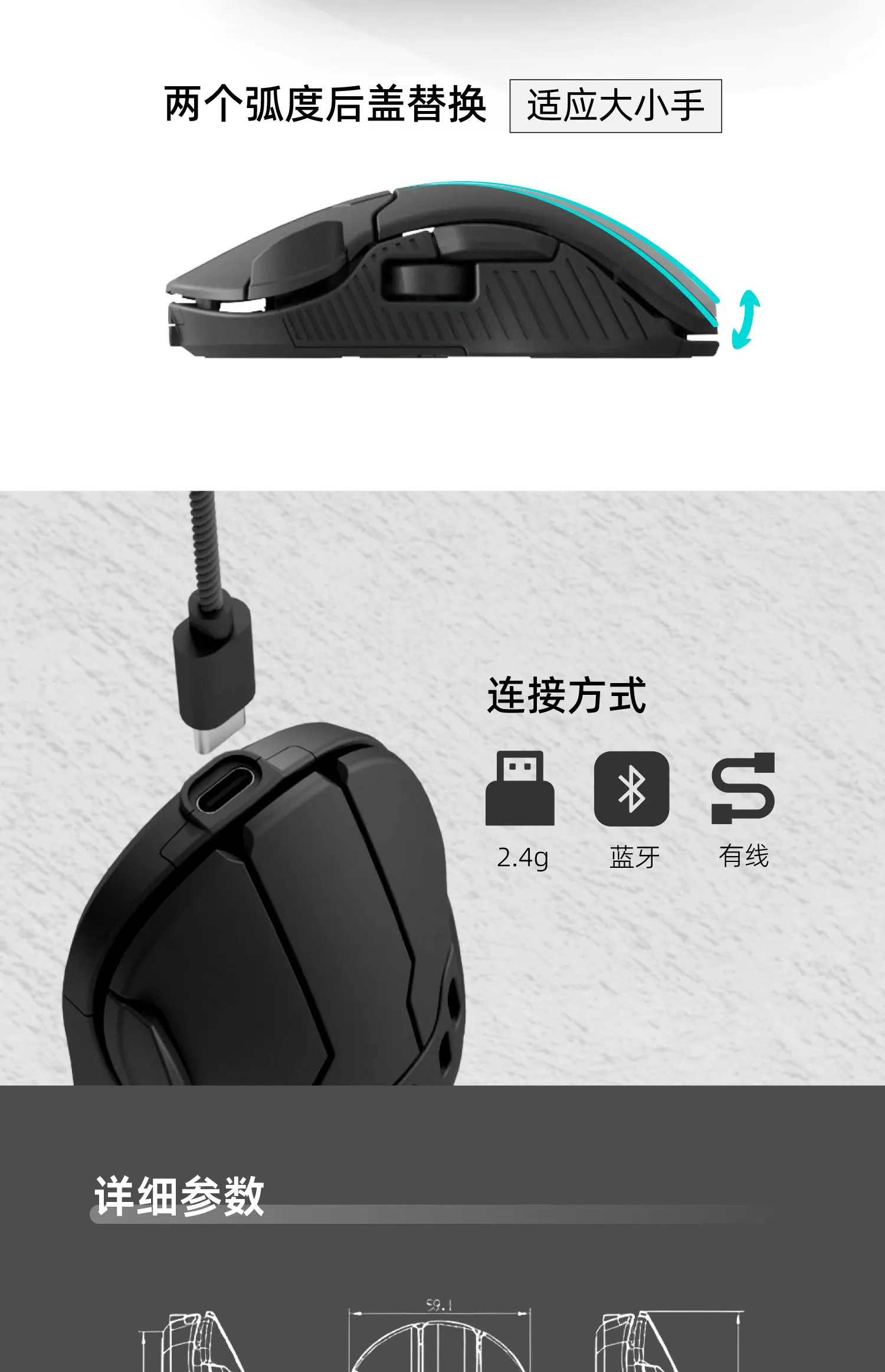 Fuacción:1. Diseño liviano: el mouse adopta un diseño liviano con un peso de aproximadamente 100 g, lo que reduce la fatiga de la mano durante el uso prolongado.3.Sensor óptico PMW3325: Equipado con un sensor óptico PMW3325, ofrece un seguimiento de alta precisión, asegurando un movimiento suave y preciso del cursor en la pantalla.4.Múltiples modos de conexión: admite conexiones inalámbricas, Bluetooth y por cable 2.4G, ofreciendo opciones de conectividad flexibles para satisfacer diferentes preferencias y escenarios del usuario.5.Batería de larga duración: cuenta con una batería de 500 mAh con un tiempo de uso integral de 80 horas, lo que reduce la frecuencia de carga y mejora la eficiencia del trabajo.6. Piezas ergonómicas reemplazables: tiene dos cubiertas traseras reemplazables con diferentes grados de curvatura y un diseño de falda lateral magnética, que se adapta a varios tamaños de mano para un agarre personalizado y cómodo.7.Rueda lateral mejorada: el mecanismo de ajuste de rueda lateral mejorado permite un desplazamiento preciso y suave, mejorando la experiencia de dibujo y satisfaciendo las necesidades de los diseñadores.